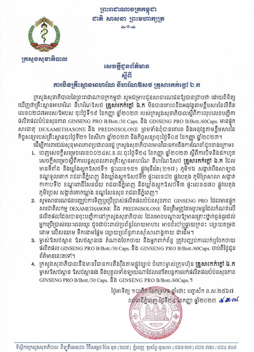 – ពុំបានគោរពនិងអនុវត្តតាមខ្លឹមសារនៃលិខិតលេខ០២៨៧អបស/ឱអបស ចុះថ្ងៃទី១៩ ខែកញ្ញា ឆ្នាំ២០២៣ របស់ក្រសួងសុខាភិបាល បានស្ដីពីការលុបលេខបញ្ជិកាផលិតផលបំប៉នសុខភាព GINSENG PRO B/Bott./30Caps.និង GINSENG PRO B/Bott./60Caps. មានផ្ទុកសារធាតុ DEXAMETHASONE និងPREDNISOLONE។