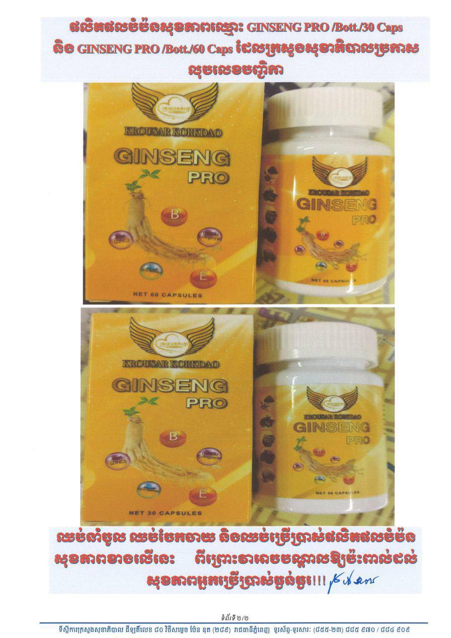– បានលក់ តាំងលក់ និងចែកចាយនូវផលិតផលបំប៉នសុខភាព GINSENG PRO ដែលមានផ្ទុកសារជាតិសកម្មមិនត្រឹមត្រូវតាមរូបមន្ដដែលកំណត់លើផលិតផលដែលបានចុះបញ្ជិកានៅក្រសួងសុខាភិបាល ហើយអាចធ្វើឱ្យប៉ះពាល់ដល់សុខភាពអ្នកប្រើប្រាស់