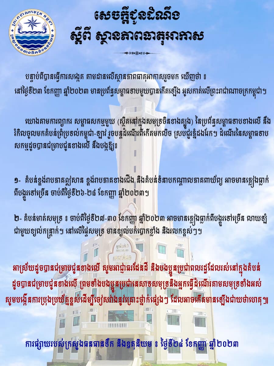 (ភ្នំពេញ)៖ នៅថ្ងៃទី២៤ ខែកញ្ញា ឆ្នាំ២០២៣ ក្រសួងធនធានទឹក និងឧតុនិយម ចេញសេចក្តីជូនដំណឹងស្តីពីស្ថានភាពធាតុអាកាស បន្ទាប់ពីបានធ្វើការសង្កេត តាមដានលើស្ថានភាពធាតុអាកាសរួចមក ឃើញថាមានប្រព័ន្ធសម្ពាធទាបមួយបានកើតឡើង អូសកាត់លើព្រះរាជាណាចក្រកម្ពុជា។
