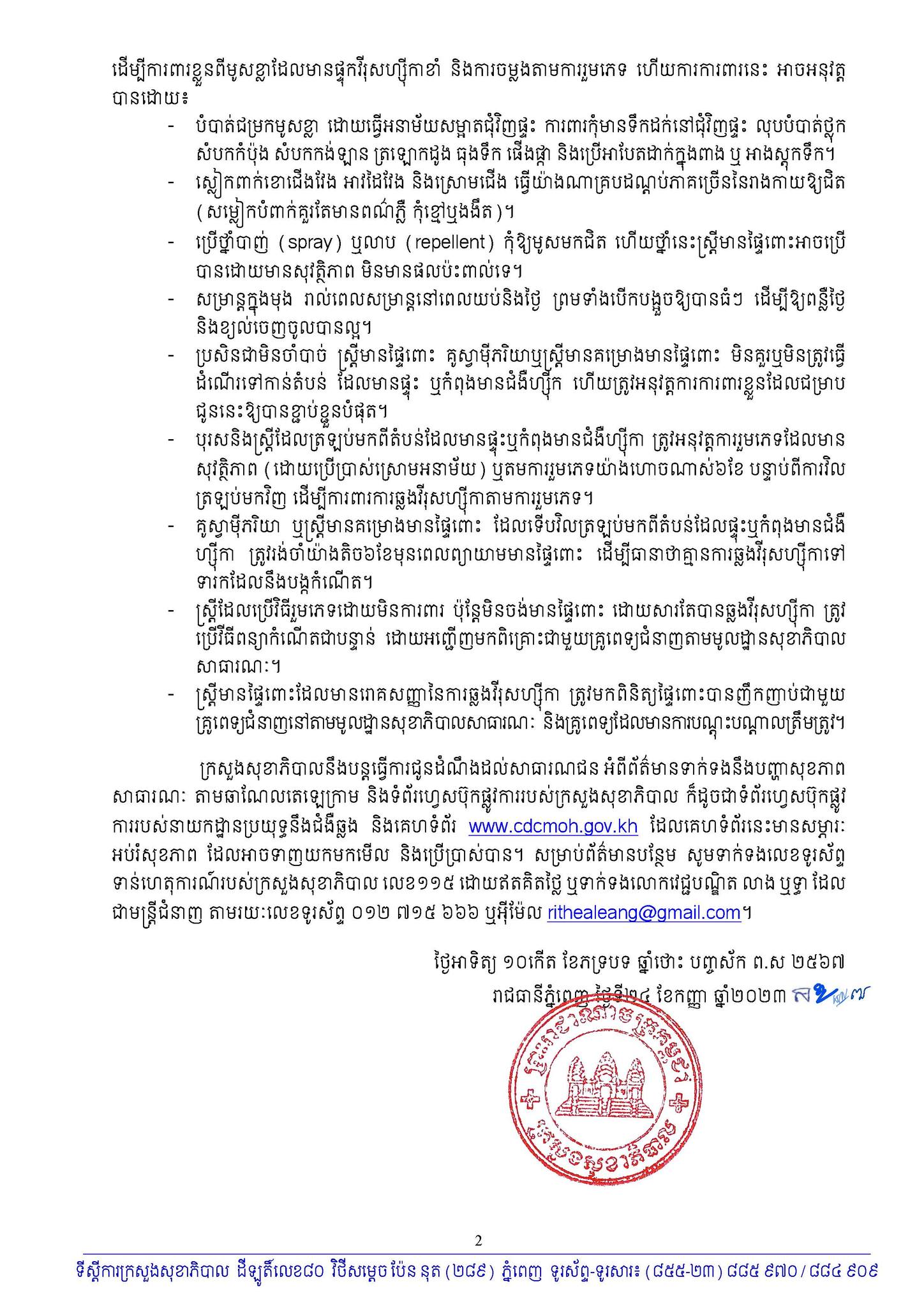ក្រសួងសុខាភិបាល បានចេញសេចក្ដីប្រកាសព័ត៌មាន ស្ដីពីករណីជំងឺហ្ស៊ីកាដំបូងនៅក្នុងឆ្នាំ២០២៣ នៅកម្ពុជា ដែលអាចឆ្លងមកមនុស្ស តាមរយៈមូសខ្លាដែលមានផ្ទុកវីរុសហ្ស៊ីកាខាំ