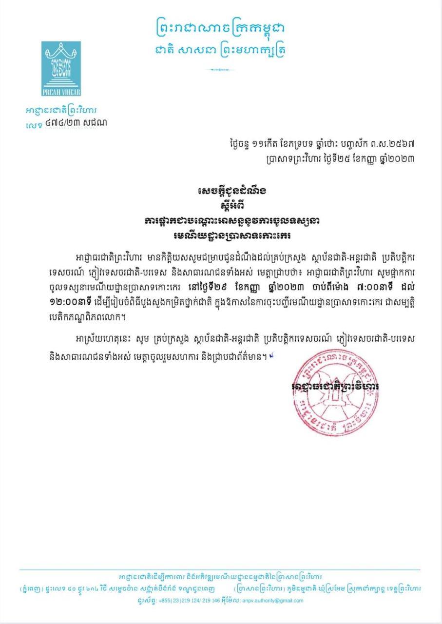 អាជ្ញាធរជាតិព្រះវិហារ មានកិត្តិយសសូមជម្រាបជូនដំណឹងដល់គ្រប់ក្រសួង ស្ថាប័នជាតិ-អន្តរជាតិ ប្រតិបត្តិករ ទេសចរណ៍ ភ្ញៀវទេសចរជាតិ-បរទេស និងសាធារណជនទាំងអស់ មេត្តាជ្រាបថា៖ អាជ្ញាធរជាតិព្រះវិហារ សូមផ្អាកការ ចូលទស្សនារមណីយដ្ឋានប្រាសាទកោះកេរ នៅថ្ងៃទី២៩ ខែកញ្ញា ឆ្នាំ២០២៣ ចាប់ពីម៉ោង ៧៖០០នាទី ដល់ ១២៖០០នាទី ដើម្បីរៀបចំពិធីបួងសួងកម្រិតថ្នាក់ជាតិ ក្នុងឱកាសនៃការចុះបញ្ជីរមណីយដ្ឋានប្រាសាទកោះកេរ ជាសម្បត្តិ បេតិកភណ្ឌពិភពលោក។