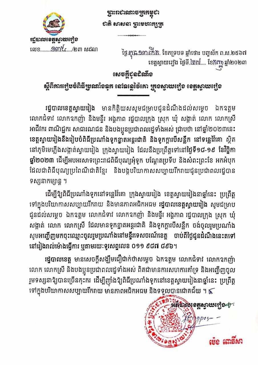 ដើម្បីឱ្យពិធីប្រណាំងទូកនៅទន្លេវ៉ៃគោ ក្រុងស្វាយរៀង ខេត្តស្វាយរៀងនាឆ្នាំនេះ ប្រព្រឹត្ត ទៅក្នុងបរិយាកាសសប្បាយរីករាយ និងមានភាពអធិកអធម រដ្ឋបាលខេត្តស្វាយរៀង សូមជម្រាប ជូនដល់សម្តេច ឯកឧត្តម លោកជំទាវ លោកឧកញ៉ា និងមន្ទីរ អង្គភាព រដ្ឋបាលក្រុង ស្រុក ឃុំ សង្កាត់ លោក លោកស្រី ដែលមានទូកខ្នាតអន្តរជាតិ និងទូកក្ដារបីសន្លឹក ចង់ចូលរួមប្រណាំង សូមអញ្ជើញមកចុះឈ្មោះចូលរួមប្រណាំងនៅមន្ទីរទេសចរណ៍ខេត្ត ចាប់ពីថ្ងៃជូនដំណឹងនេះតទៅ នៅរៀងរាល់ម៉ោងធ្វើការ ឬតាមរយៈទូរសព្ទលេខ ០១១ ៩៨៧ ៨៩៦។