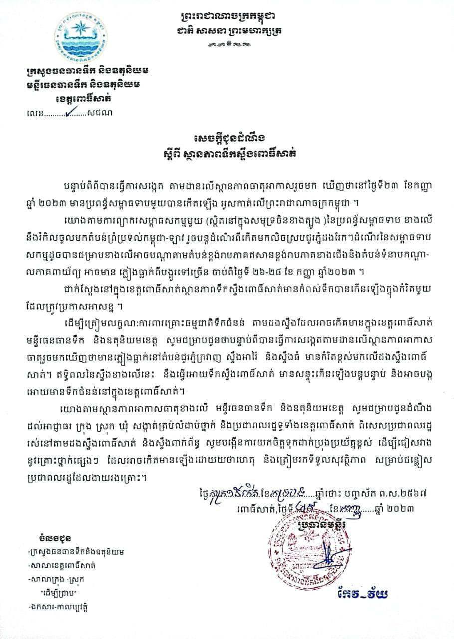 ខេត្តពោធិ៍សាត់៖ នៅថ្ងៃទី២៩ ខែកញ្ញា ឆ្នាំ២០២៣ យោងតាមការចុះផ្សាយរបស់ មន្ទីរធនធានទឹកនិងឧតុនិយមខេត្តពោធិ៍សាត់ បានចេញសេចក្តីជូនដំណឹង ស្ដីពីស្ថានភាពទឹកស្ទឹងពោធិ៍សាត់ កើនឡើង ក្នុងកំរិតប្រកាសអាសន្ន។