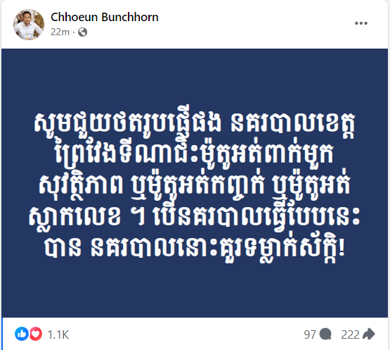 ខេត្តព្រៃវែង៖ នៅថ្ងៃទី២៩ ខែកញ្ញា ឆ្នាំ២០២៣ យោងតាមគណនីហ្វេសប៊ុកផ្ទាល់របស់ លោកឧត្តមសេនីយ៍ទោ ឈឿន ប៊ុនឆន ស្នងការនគរបាលខេត្តព្រៃវែង នៅមុននេះបន្តិច បានប្រកាសឱ្យបងប្អូនប្រជាពលរដ្ឋខេត្តព្រៃវែងជួយថតផ្ញើផង ក្នុងករណីដែលនគរបាលខេត្តព្រៃវែងរូបណា ជិះម៉ូតូអត់ពាក់មួកសុវត្ថិភាព ឬម៉ូតូអត់កញ្ចក់ ឬម៉ូតូអត់ស្លាកលេខ នគរបាលរូបនោះគួរត្រូវទម្លាក់ស័ក្កិចោល។