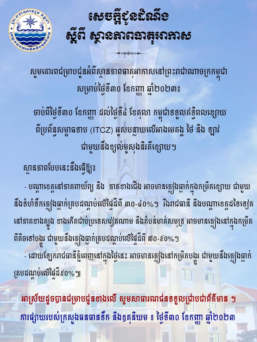 រាជធានីភ្នំពេញ៖ នៅថ្ងៃទី៣០ ខែកញ្ញា ឆ្នាំ២០២៣ យោងតាមការចុះផ្សាយរបស់ ក្រសួងធនធានទឹក និងឧតុនិយម បានចេញសេចក្ដីជូនដំណឹង ស្ដីពីស្ថានភាពធាតុអាកាស នៅព្រះរាជាណាចក្រកម្ពុជា ចាប់ពីថ្ងៃទី៣០ ខែកញ្ញា ដល់ថ្ងៃទី៤ ខែតុលា ឆ្នាំ២០២៣។