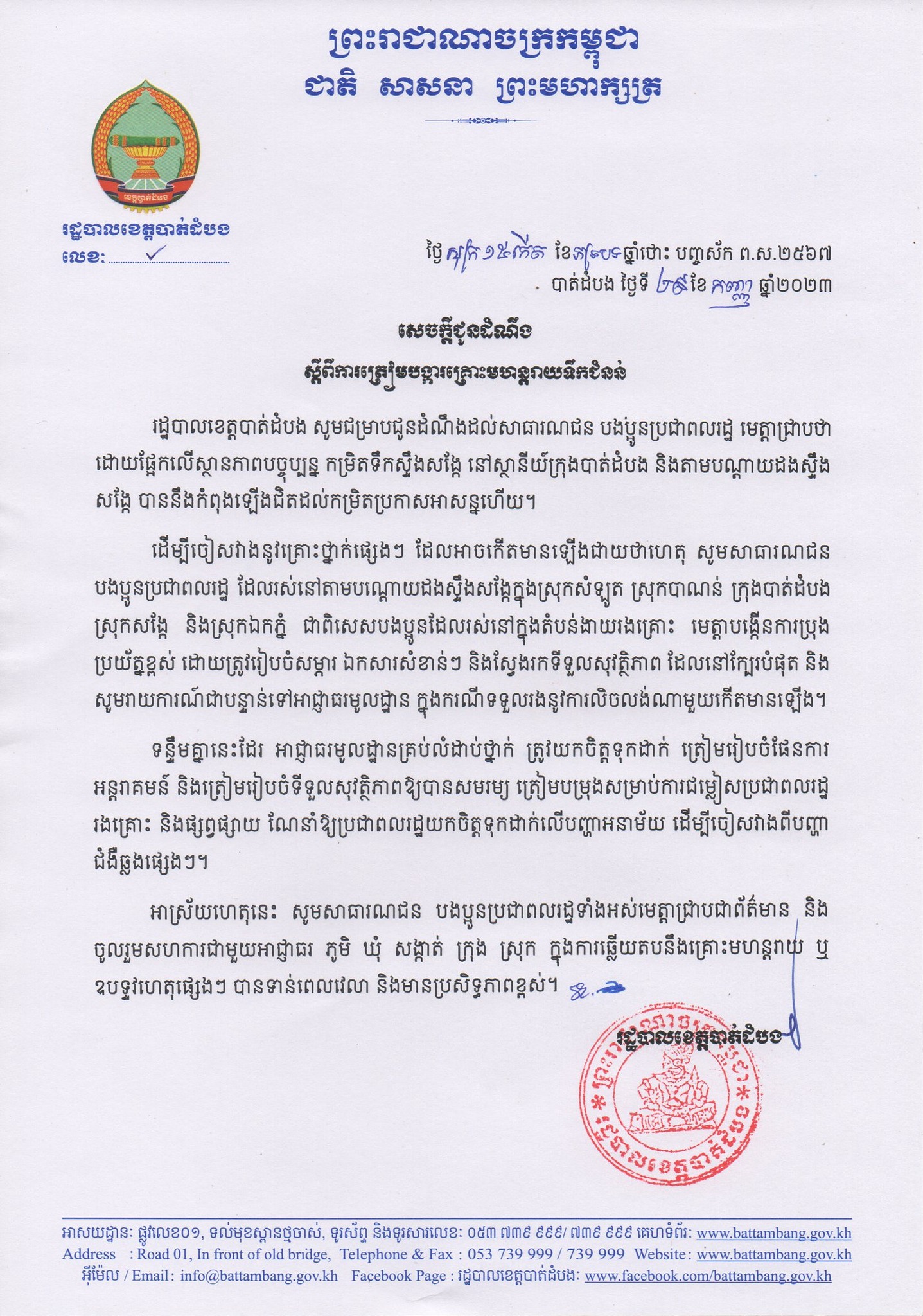 ខេត្តបាត់ដំបង៖ នៅថ្ងៃទី២៩ ខែកញ្ញា ឆ្នាំ២០២៣នេះ យោងតាមការចុះផ្សាយរបស់ រដ្ឋបាលខេត្តបាត់ដំបង បានចេញសេចក្ដីជូនដំណឹង ស្ដីពីការត្រៀមបង្ការគ្រោះមហន្តរាយទឹកជំនន់។