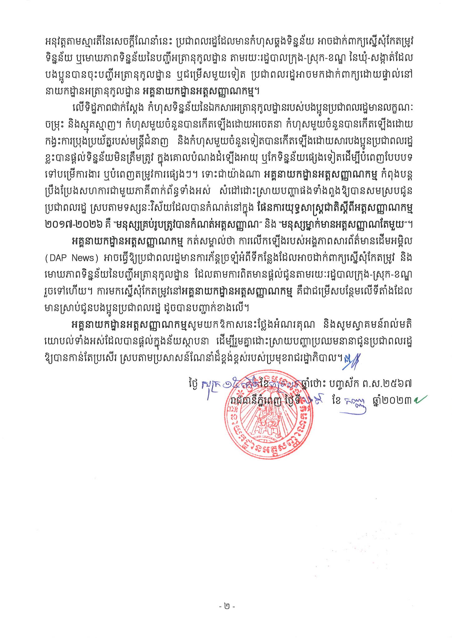 ទោះជាយ៉ាងណា អគ្គនាយកដ្ឋានអត្តសញ្ញាណកម្ម កំពុងបន្តប្រឹងប្រែងសហការជាមួយភាគីពាក់ព័ន្ធទាំងអស់ សំដៅដោះស្រាយបញ្ហាផងទាំងពួងឱ្យបានសមស្របជូន ប្រជាពលរដ្ឋ ស្របតាមទស្សនៈវិស័យដែលបានកំណត់នៅក្នុង ផែនការយុទ្ធសាស្ត្រជាតិស្តីពីអត្តសញ្ញាណកម្ម ២០១៧-២០២៦ គឺ “មនុស្សគ្រប់រូបត្រូវបានកំណត់អត្តសញ្ញាណ” និង “មនុស្សម្នាក់មានអត្តសញ្ញាណតែមួយ”។ អគ្គនាយកដ្ឋានអត្តសញ្ញាណកម្ម កត់សម្គាល់ថា «ការលើកឡើងរបស់អង្គភាពសារព័ត៌មានក្នុងស្រុក អាចធ្វើឱ្យប្រជាពលរដ្ឋមានការភ័ន្តច្រឡំអំពីទីកន្លែងដែលអាចដាក់ពាក្យស្នើសុំកែតម្រូវ និង មោឃភាពទិន្នន័យនៃបញ្ជីអត្រានុកូលដ្ឋាន ដែលតាមការពិតមានផ្ដល់ជូនតាមរយៈរដ្ឋបាលក្រុង-ស្រុក-ខណ្ឌ រួចទៅហើយ។» ការមកស្នើសុំកែតម្រូវនៅអគ្គនាយកដ្ឋានអត្តសញ្ញាណកម្ម គឺជាជម្រើសបន្ថែមលើទីតាំងដែលមានស្រាប់ជូនបងប្អូនប្រជាពលរដ្ឋដូចបានបញ្ជាក់ខាងលើ ៕