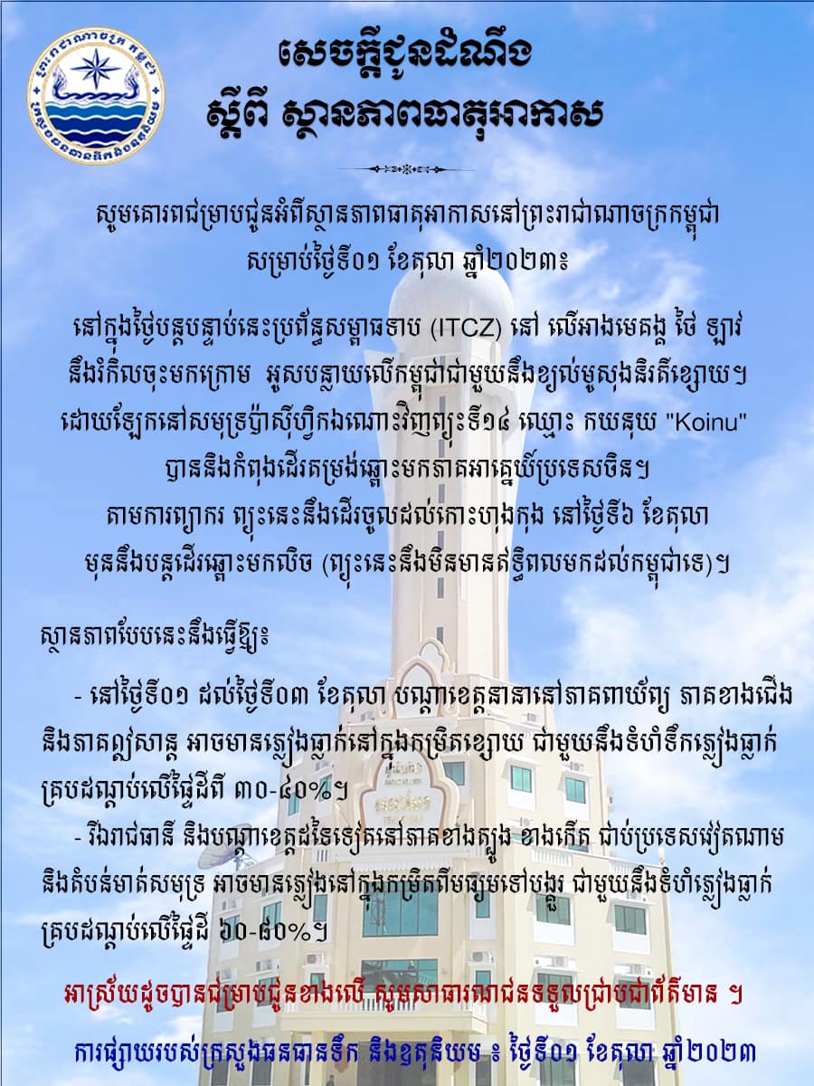 (ភ្នំពេញ)៖ នៅថ្ងៃទី១ ខែតុលា ឆ្នាំ២០២៣ ក្រសួងធនធានទឹក និងឧតុនិយម បានចេញសេចក្តីជូនដំណឹង ស្តីពីស្ថានភាពធាតុអាកាសនៅកម្ពុជា។ ក្រសួងបានជូនដំណឹងថា នៅក្នុងថ្ងៃបន្តបន្ទាប់នេះប្រព័ន្ធសម្ពាធទាប (ITCZ) នៅលើអាងមេគង្គ ថៃ ឡាវ នឹងរំកិលចុះមកក្រោម អូសបន្លាយលើកម្ពុជាជាមួយនឹងខ្យល់មូសុងនិរតីខ្សោយ។