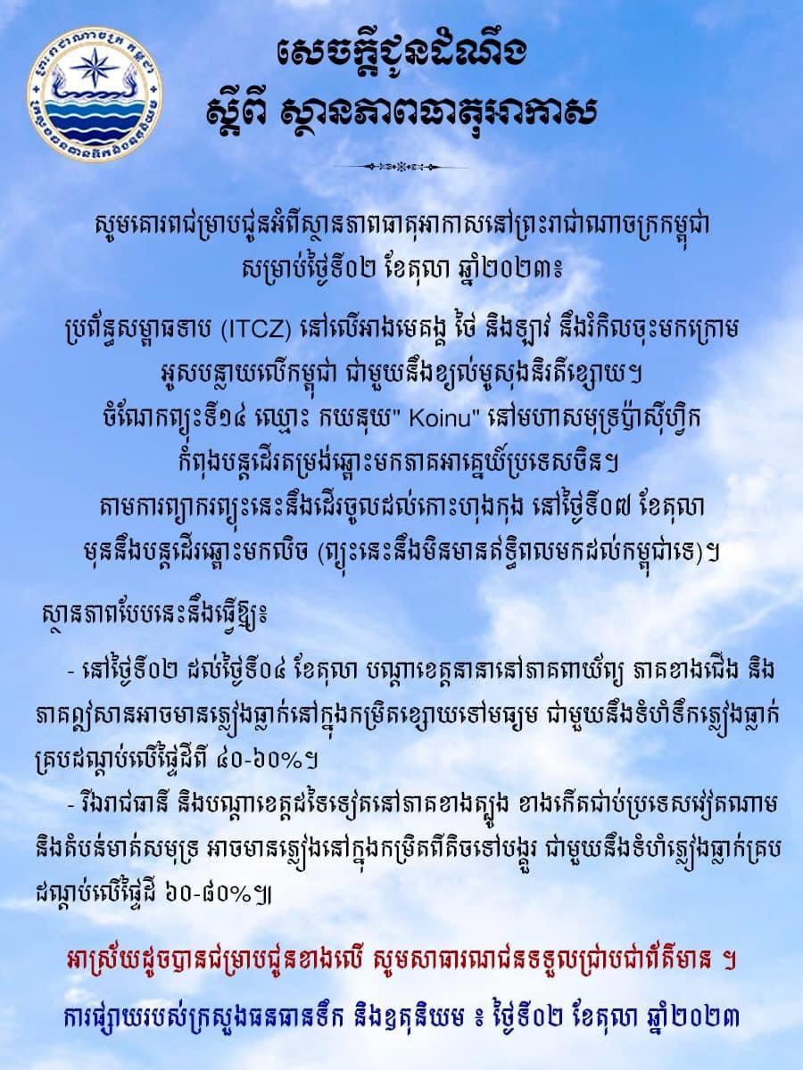 ក្រសួងធនធានទឹក សូមជម្រាបជូនថា ស្ថានភាពធាតុអាកាសនៅព្រះរាជាណាចក្រកម្ពុជា សម្រាប់ថ្ងៃទី០២ ខែតុលា ឆ្នាំ២០២៣៖ ប្រព័ន្ធសម្ពាធទាប (ITCZ) នៅលើអាងមេគង្គ ថៃ និងឡាវ នឹងរំកិលចុះមកក្រោម អូសបន្លាយលើកម្ពុជា ជាមួយនឹងខ្យល់មូសុងនិរតីខ្សោយ។