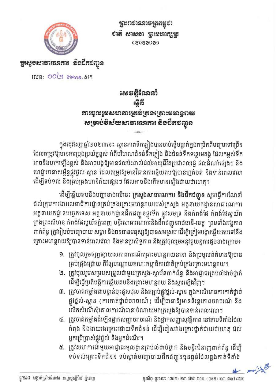 រាជធានីភ្នំពេញ៖ នៅថ្ងៃទី០២ ខែតុលា ឆ្នាំ២០២៣ យោងតាមការចុះផ្សាយរបស់ ក្រសួងសាធារណការ និងដឹកជញ្ជូន បានចេញសេចក្ដី ណែនាំ ស្តីពីការចូលរួមសហការគ្រប់គ្រងគ្រោះមហន្តរាយ សម្រាប់វិស័យសាធារណការ និងដឹកជញ្ជូន។