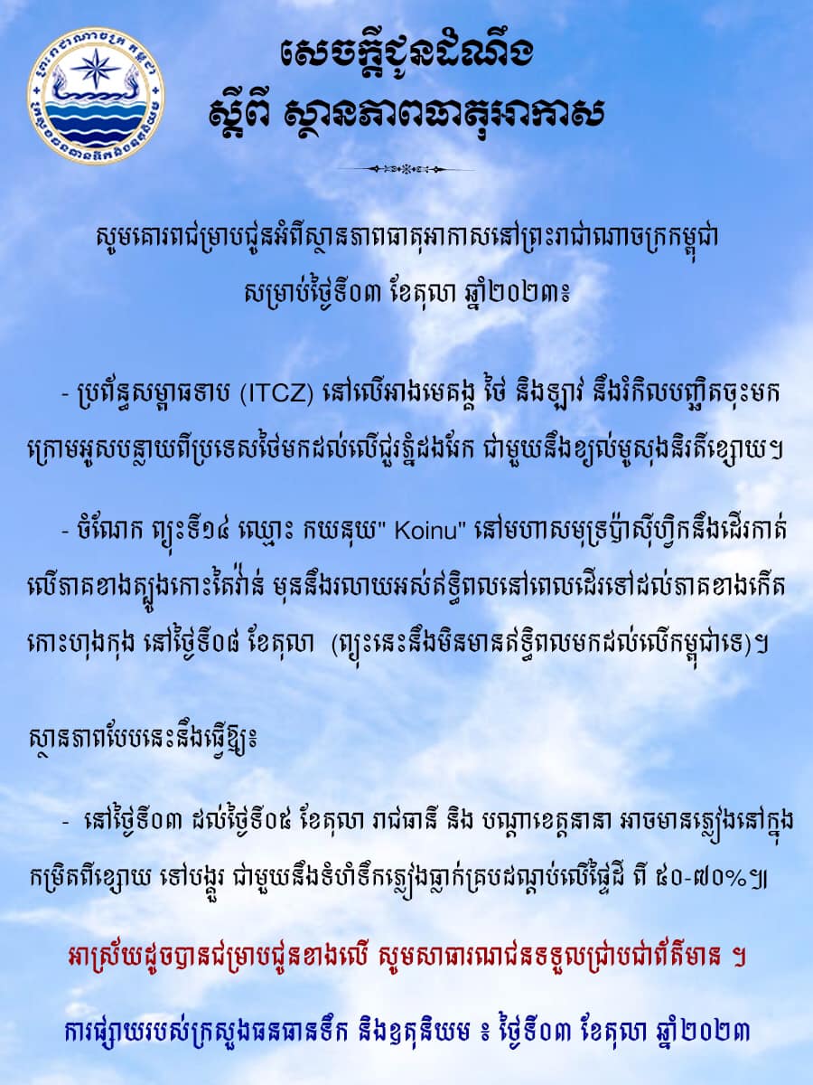រាជធានីភ្នំពេញ៖ នៅថ្ងៃទី០៣ ខែតុលា ឆ្នាំ២០២៣ យោងតាមការចុះផ្សាយរបស់ ក្រសួងធនធានទឹក និងឧតុនិយម បានចេញសេចក្ដីជូនដំណឹង ស្ដីពី ស្ថានភាពធាតុអាកាស សម្រាប់ថ្ងៃទី០៣ ខែតុលា ឆ្នាំ២០២៣។