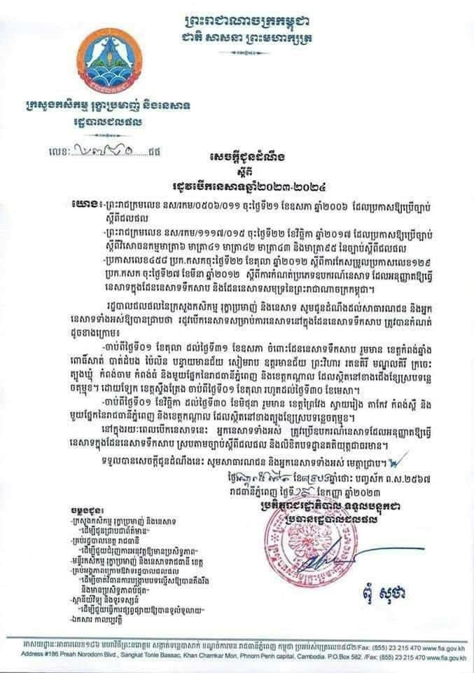 រាជធានីភ្នំពេញ៖ នៅថ្ងៃទី០៣ ខែតុលា ឆ្នាំ២០២៣ យោងតាមការចុះផ្សាយរបស់ រដ្ឋបាលជលផលនៃក្រសួងកសិកម្ម រុក្ខាប្រមាញ់ និងនេសាទ បានចេញសេចក្ដីជូនដំណឹង ស្ដីពីរដូវបើកនេសាទ សម្រាប់ឆ្នាំ២០២៣-២០២៤។