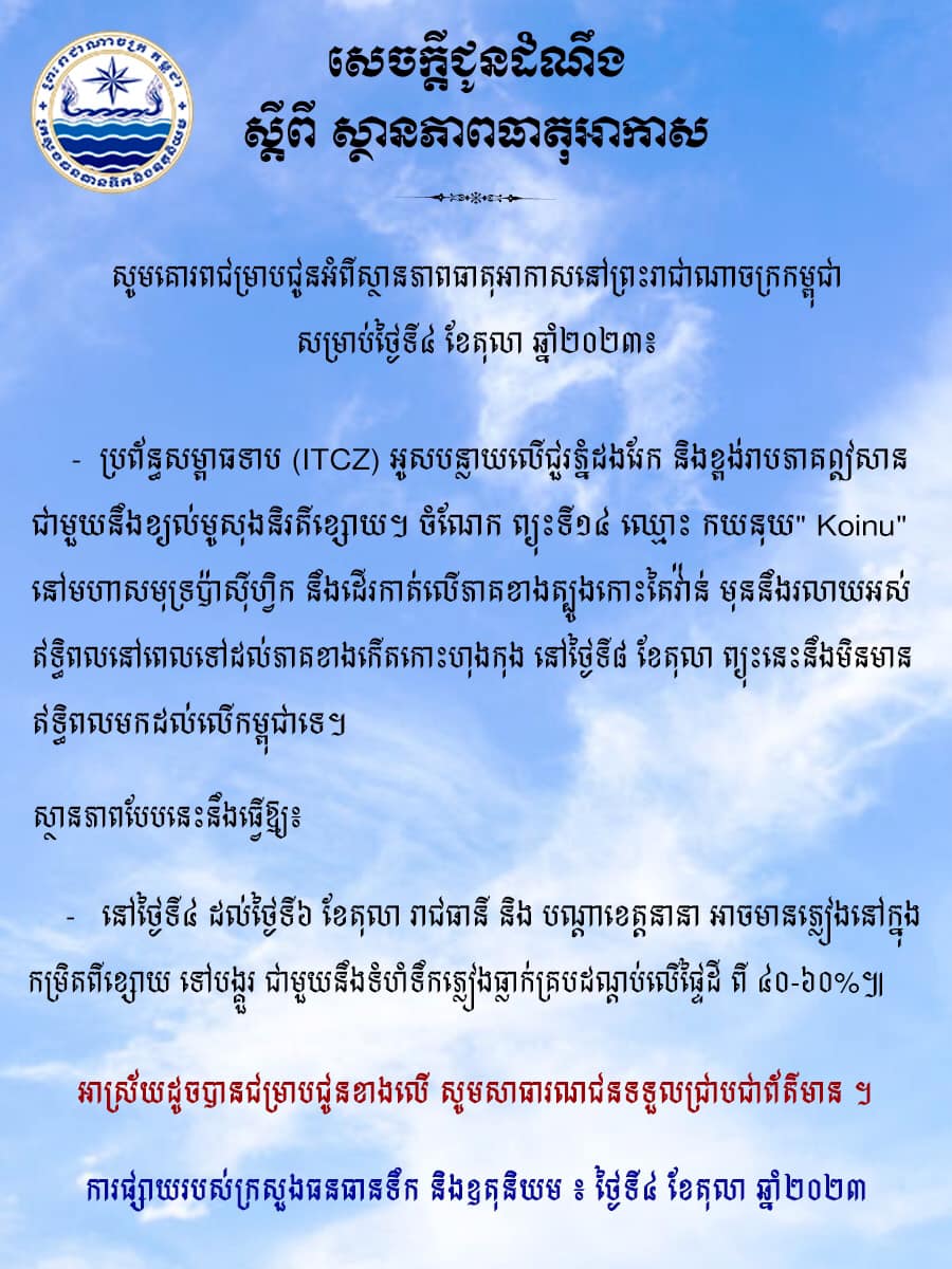 រាជធានីភ្នំពេញ៖ នៅថ្ងៃទី០៤ ខែតុលា ឆ្នាំ២០២៣ យោងតាមការចុះផ្សាយរបស់ ក្រសួងធនធានទឹក និងឧតុនិយម បានចេញសេចក្ដីជូនដំណឹង ស្ដីពីស្ថានភាពធាតុអាកាស សម្រាប់ថ្ងៃទី០៤ ខែតុលា ឆ្នាំ២០២៣។