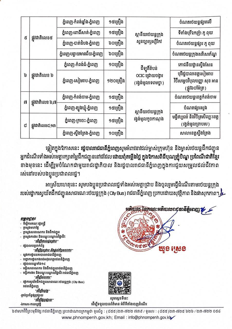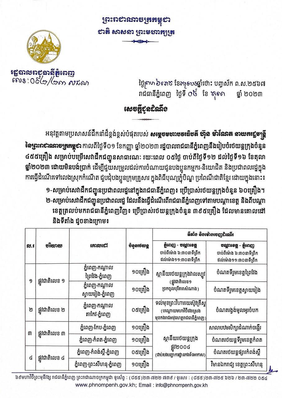 ដោយអនុវត្តតាមប្រសាសន៍ដឹកនាំដ៏ខ្ពង់ខ្ពស់បំផុតរបស់ សម្ដេចមហាបវរធិបតី ហ៊ុន ម៉ាណែត នាយករដ្ឋមន្តី នៃព្រះរាជាណាចក្រកម្ពុជា កាលពីថ្ងៃទី០១ ខែកញ្ញា ឆ្នាំ២០២៣ រដ្ឋបាលរាជធានីភ្នំពេញនឹងរៀបចំរថយន្តក្រុងចំនួន ៤៥៥គ្រឿង សម្រាប់បម្រើសេវាដឹកជញ្ជូនសាធារណៈ រយៈពេល ០៥ថ្ងៃ ចាប់ពីថ្ងៃទី១២ ដល់ថ្ងៃទី១៦ ខែតុលា ឆ្នាំ២០២៣ ដោយមិនបង់ប្រាក់ ដើម្បីជួយសម្រួលដល់ការចំណាយជូនបងប្អូនកម្មករ-និយោជិត និងប្រជាពលរដ្ឋក្នុង ការធ្វើដំណើរទៅលេងស្រុកកំណើត ជួបជុំបងប្អូនក្រុមគ្រួសារ ក្នុងពិធីបុណ្យភ្ជុំបិណ្ឌ ប្រពៃណីជាតិខ្មែរ ៕