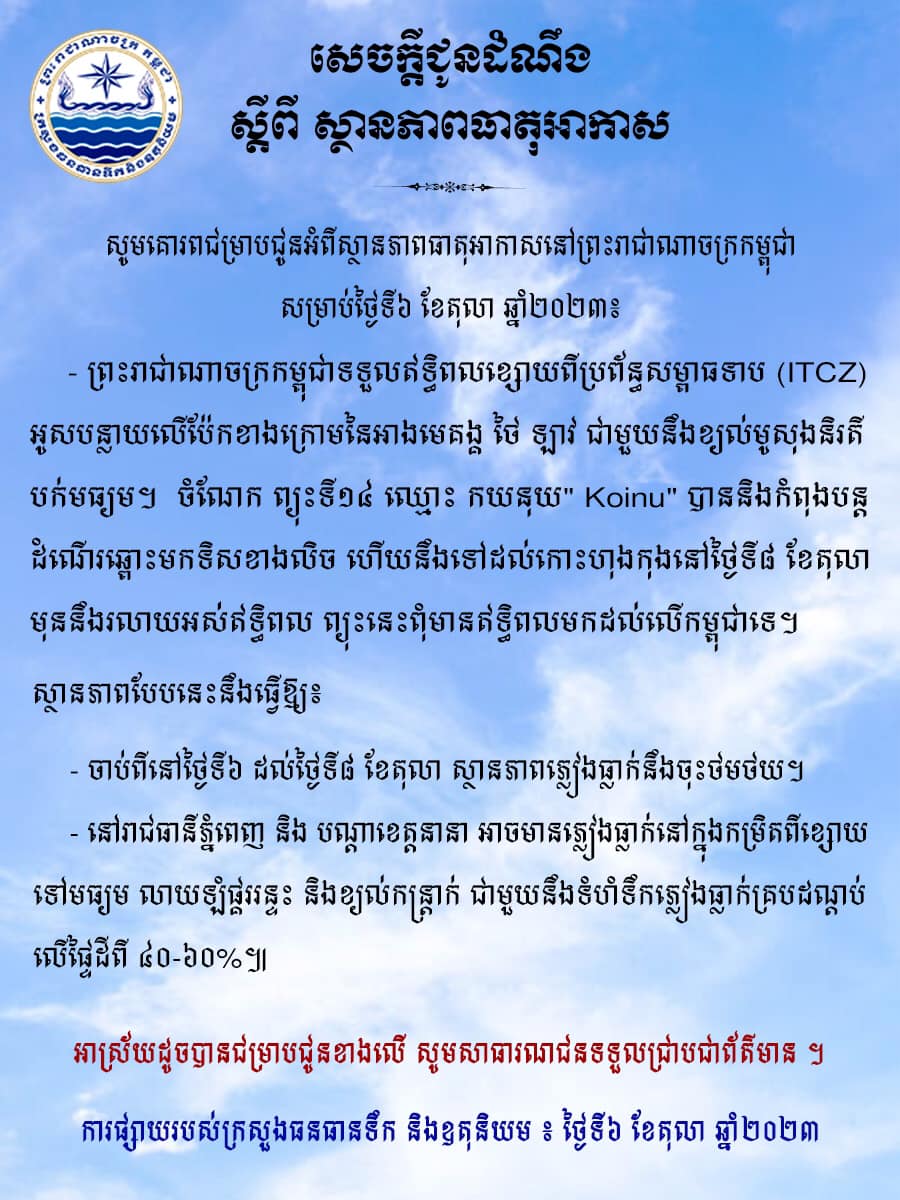 រាជធានីភ្នំពេញ៖ នៅថ្ងៃទី០៦ ខែតុលា ឆ្នាំ២០២៣ យោងតាមការចុះផ្សាយរបស់ ក្រសួងធនធានទឹក និងឧតុនិយម បានចេញសេចក្ដីជូនដំណឹង ស្ដីពី ស្ថានភាពធាតុអាកាស សម្រាប់ថ្ងៃទី០៦ ខែតុលា ឆ្នាំ២០២៣។