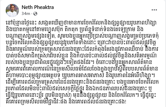 យោងតាមរយៈបណ្ដាញសង្គមហ្វេសប៊ុក ឯកឧត្តម នេត្រ ភក្ត្រា បានបង្ហោះខ្លឹមសារថា៖ «នៅប៉ុន្មានថ្ងៃនេះ ខ្ញុំសង្កេតឃើញថាមានការចែករំលែក និងផ្សព្វផ្សាយរូបភាពហិង្សា និងឃាតកម្មនៅតាមហ្វេសប៊ុក តិកតុក ប្រព័ន្ធទំនាក់ទំនងតេឡេក្រាម និងបណ្តាញសង្គមផ្សេងទៀត ដូចនេះសូមបងប្អូនអ្នកប្រើប្រាស់បណ្តាញសង្គមគ្រប់ប្រភេទកុំបន្តចែករំលែក និងផ្សព្វផ្សាយនូវរូបភាពទាំងនោះ ព្រោះវាបានប៉ះពាល់ដល់ផ្លូវចិត្ត និងអារម្មណ៍របស់ក្រុមគ្រួសារជនរងគ្រោះដែលកំពុងតែរងនូវភាពឈឺចាប់ និងការបាត់បង់សមាជិកគ្រួសាររបស់ខ្លួន និងក៏បានប៉ះពាល់ដល់ផ្លូវចិត្ត និងសតិអារម្មណ៍របស់បងប្អូនប្រជាពលរដ្ឋផ្សេងៗផងដែរទៀត។