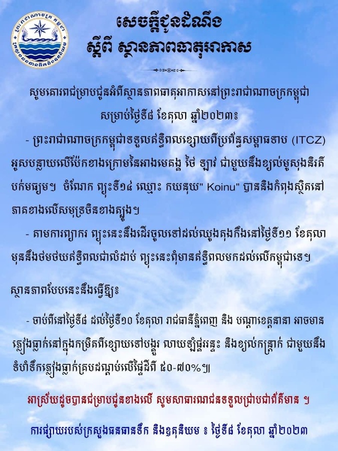 (ភ្នំពេញ)៖ នៅថ្ងៃទី៨ ខែតុលា ឆ្នាំ២០២៣ ក្រសួងធនធានទឹក និងឧតុនិយម បានចេញសេចក្តីជូនដំណឹង ស្តីពីស្ថានភាពធាតុអាកាសនៅកម្ពុជា។ ក្រសួងបានជូនដំណឹងថា នៅក្នុងថ្ងៃបន្តបន្ទាប់នេះប្រព័ន្ធសម្ពាធទាប (ITCZ) អូសបន្លាយលើប៉ែកខាងក្រោមអាងមេគង្គ ថៃ ឡាវ ជាមួយនឹងខ្យល់មូសុងនិរតីបក់មធ្យម។។