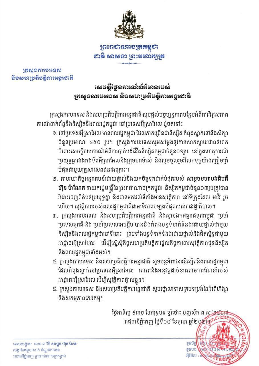 ក្រសួងការបរទេស និងសហប្រតិបត្តិការអន្តរជាតិ ចេញសេចក្តីថ្លែងការណ៍ ស្តីពីបច្ចុប្បន្នភាពបន្ថែមអំពីការវិវត្តសភាពការណ៍ពាក់ព័ន្ធនឹងនិស្សិតនិងពលរដ្ឋកម្ពុជា នៅប្រទេសអ៊ីស្រាអែល