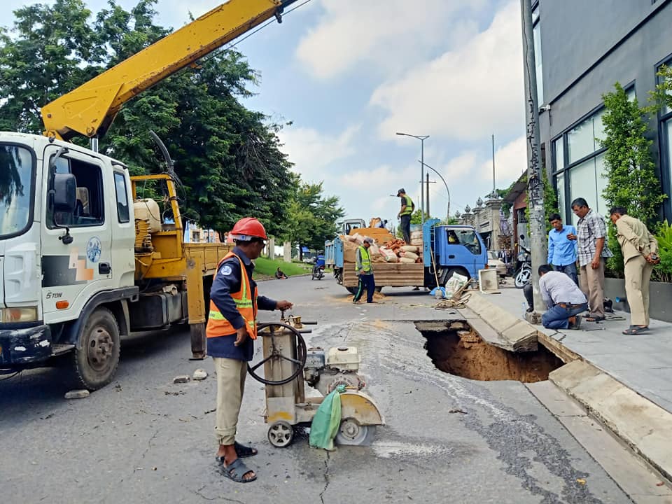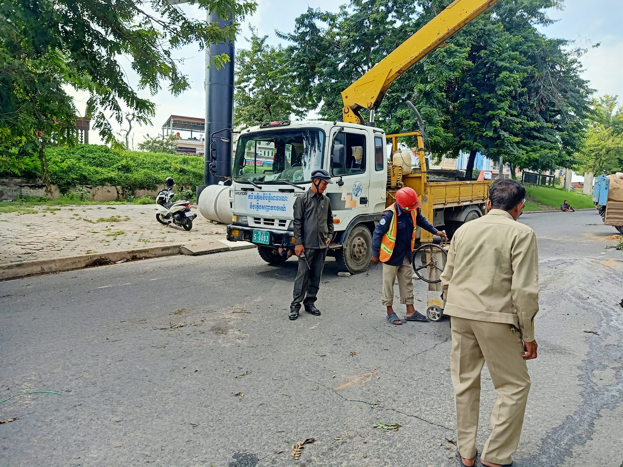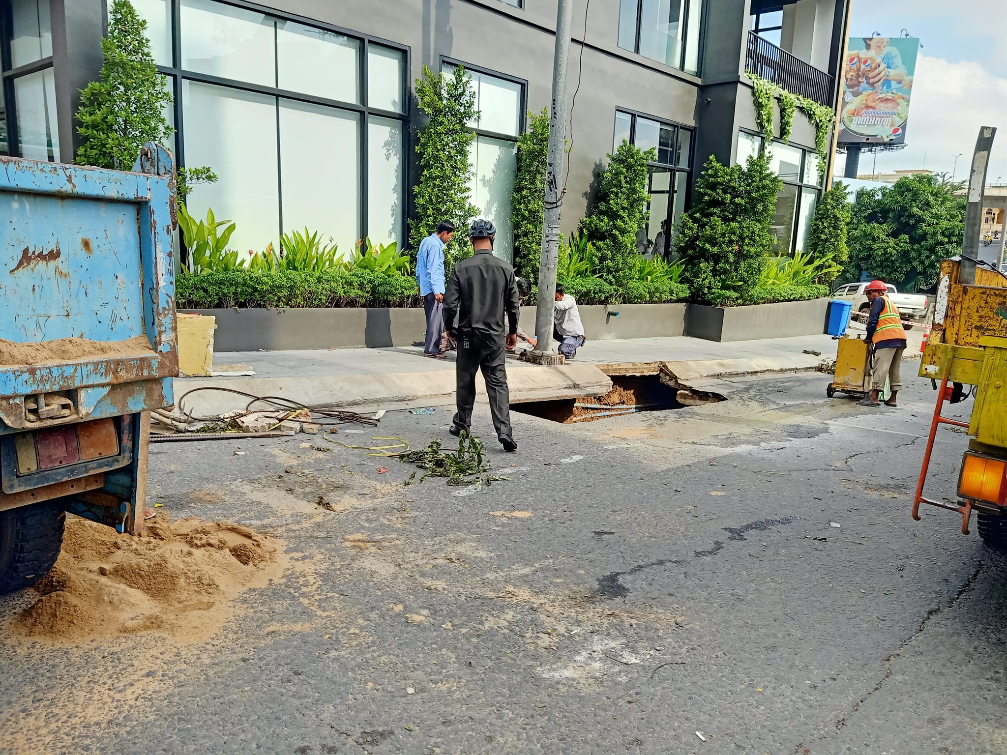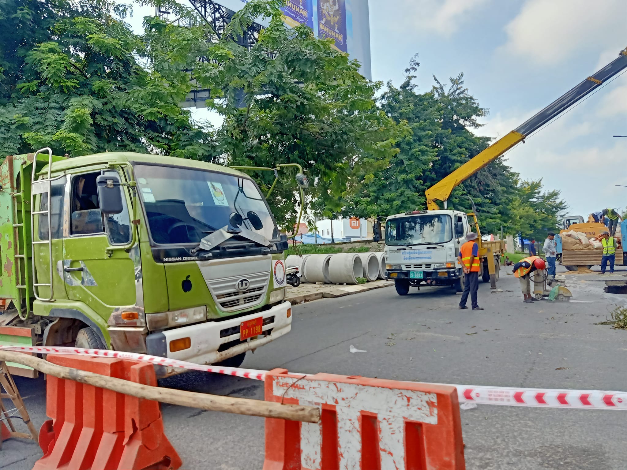 មន្ទីរសាធារណការក្រុង បានស្ថាបនាជួសជុលដាក់ប្រព័ន្ធលូកន្លែងបាក់ស្រុតនៅទីតាំងផ្លូវចុះពីស្ពានអាកាសស្ទឹងមានជ័យឡើងវិញ