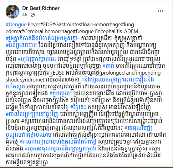 បើយោងតាមការបង្ហោះពីគណនីហ្វេសប៊ុករបស់ Dr. Beat Richner បានបញ្ជាក់ថា៖ «រួមគ្នាកំចាត់និងបំបាត់ជម្រកមូសខ្លា ការពារបុត្រធីតា កុំឲ្យមូសខ្លាខាំ ជំងឺគ្រុនឈាមនេះ អាចវិវត្តយ៉ាងលឿនទៅជាធ្ងន់ធ្ងរស្មុគស្មាញ និងបណ្តាលឲ្យហូរឈាមហើមសួត ហូរឈាមក្នុងខួរក្បាលនិងរលាកខួរក្បាល ជាករណីដ៏កម្របំផុត ក្មេងប្រុសម្នាក់នេះ អាយុ ១១ឆ្នាំ ត្រូវបានព្យាបាលជំងឺគ្រុនឈាម បញ្ចូលសេរ៉ូមអស់២លីត្រ មុនមកដល់មន្ទីរពេទ្យគន្ធបុប្ផា គាត់មានជំងឺគ្រុនឈាមកម្រិតធ្ងន់ធ្ងរស្មុគស្មាញបំផុត (EDS): អស់ជីពចរយូរថ្ងៃ(prolonged and impending shock syndrome) លើសពី៣០ម៉ោង និងហូរឈាមក្នុងក្រពះពោះវៀននិងហើមសួត ចុងក្រោយសន្លប់បាត់ស្មារតី ដោយសាររលាកខួរក្បាលនិងហូរឈាមក្នុងខួរក្បាលទៀតផង។ »