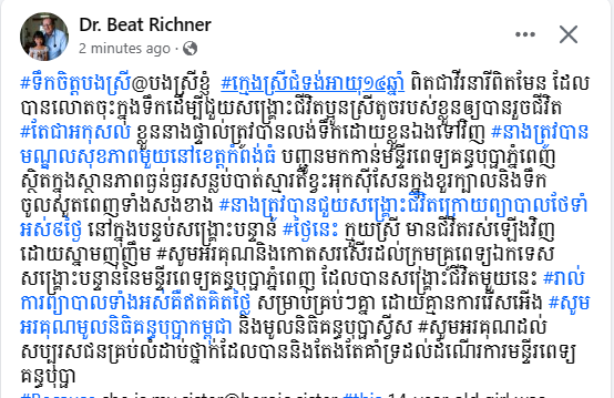 តាមរយៈខ្លឹមសារបង្ហោះរបស់ Dr. Beat Richner បានសរសេររៀបរាប់បញ្ជាក់ថា៖ « នេះជាទឹកចិត្តបងស្រី ក្មេងស្រីជំទង់អាយុ១៤ឆ្នាំ ពិតជាវីរនារីពិតមែន ដែលបានលោតចុះក្នុងទឹក ដើម្បីជួយសង្រ្គោះជីវិតប្អូនស្រីតូចរបស់ខ្លួនឲ្យបានរួចជីវិត។ តែជាអកុសល ខ្លួននាងផ្ទាល់ត្រូវបានលង់ទឹកដោយខ្លួនឯងទៅវិញ នាងត្រូវបានមណ្ឌលសុខភាពមួយនៅខេត្តកំពង់ធំ បញ្ជូនមកកាន់មន្ទីរពេទ្យគន្ធបុប្ផាភ្នំពេញ ស្ថិតក្នុងស្ថានភាពធ្ងន់ធ្ងរសន្លប់បាត់ស្មារតីខ្វះអុកស៊ីសែនក្នុងខួរក្បាល និងទឹកចូលសួតពេញទាំងសងខាង នាងត្រូវបានជួយសង្រ្គោះជីវិតក្រោយព្យាបាលថែទាំអស់ ៩ថ្ងៃ នៅក្នុងបន្ទប់សង្រ្គោះបន្ទាន់។