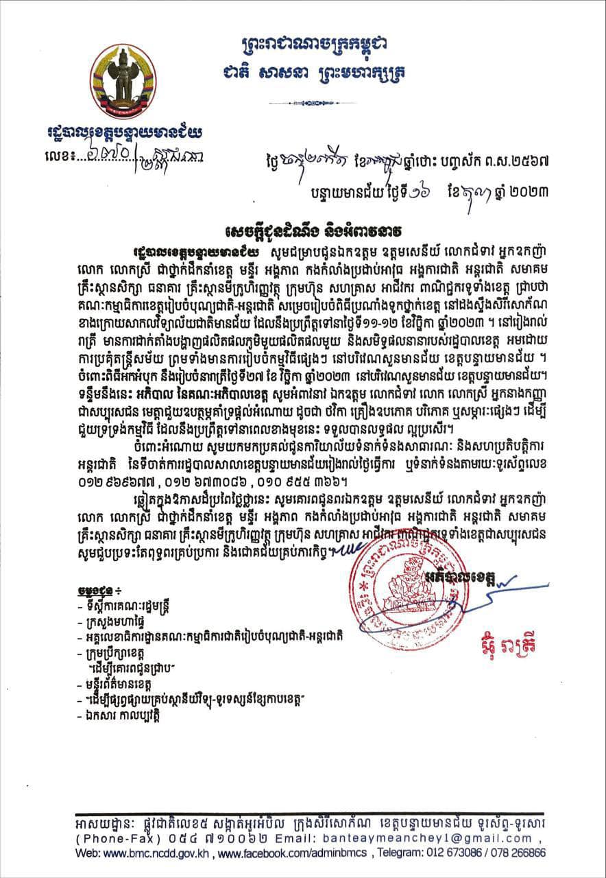 នៅរៀងរាល់ រាត្រី មានការដាក់តាំងបង្ហាញផលិតផលភូមិមួយផលិតផលមួយ និងសមិទ្ធផលនានារបស់រដ្ឋបាលខេត្ត អមដោយ ការប្រគុំតន្រ្តីសម័យ ព្រមទាំងមានការរៀបចំកម្មវិធីផ្សេងៗ នៅបរិវេណសួនមានជ័យ ខេត្តបន្ទាយមានជ័យ។ ចំពោះពិធីអកអំបុក នឹងរៀបចំនារាត្រីថ្ងៃទី២៧ ខែ វិច្ឆិកា ឆ្នាំ២០២៣ នៅបរិវេណសួនមានជ័យ ខេត្តបន្ទាយមានជ័យ។ ទន្ទឹមនឹងនេះ អភិបាល នៃគណៈអភិបាលខេត្ត សូមអំពាវនាវ ឯកឧត្តម លោកជំទាវ លោក លោកស្រី អ្នកនាងកញ្ញា ជាសប្បុរសជន មេត្តាជួយឧបត្ថម្ភគាំទ្រផ្ដល់អំណោយ ដូចជា ថវិកា គ្រឿងឧបភោគ បរិភោគ ឬសម្ភារៈផ្សេងៗ ដើម្បី ជួយទ្រទ្រង់កម្មវិធី ដែលនឹងប្រព្រឹត្តទៅនាពេលខាងមុខនេះ ទទួលបានលទ្ធផល ល្អប្រសើរ។ ចំពោះអំណោយ សូមយកមកប្រគល់ជូនការិយាល័យទំនាក់ទំនងសាធារណៈ និងសហប្រតិបត្តិការ អន្តរជាតិ នៃទីចាត់ការរដ្ឋបាលសាលាខេត្តបន្ទាយមានជ័យរៀងរាល់ថ្ងៃធ្វើការ ឬទំនាក់ទំនងតាមរយៈទូរស័ព្ទលេខ ០១២ ៩៦៩៦៧៧, ០១២ ៦៧៣០៨៦, ០១០ ៩៥៥ ៣៦៦។