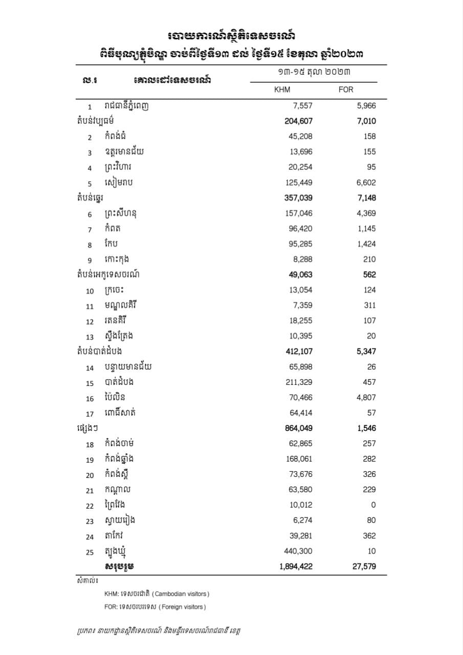 ក្រសួងទេសចរណ៍ បានបង្ហាញពីស្ថានភាពទេសចរណ៍ និងបងប្អូនប្រជាពលរដ្ឋដែលបានដើរកម្សាន្តនាឱកាសពិធីបុណ្យភ្ជំបិណ្ឌ ចាប់ពីថ្ងៃទី១៣ ដល់ថ្ងៃទី១៥ ខែតុលា ឆ្នាំ២០២៣ រួមមាន៖