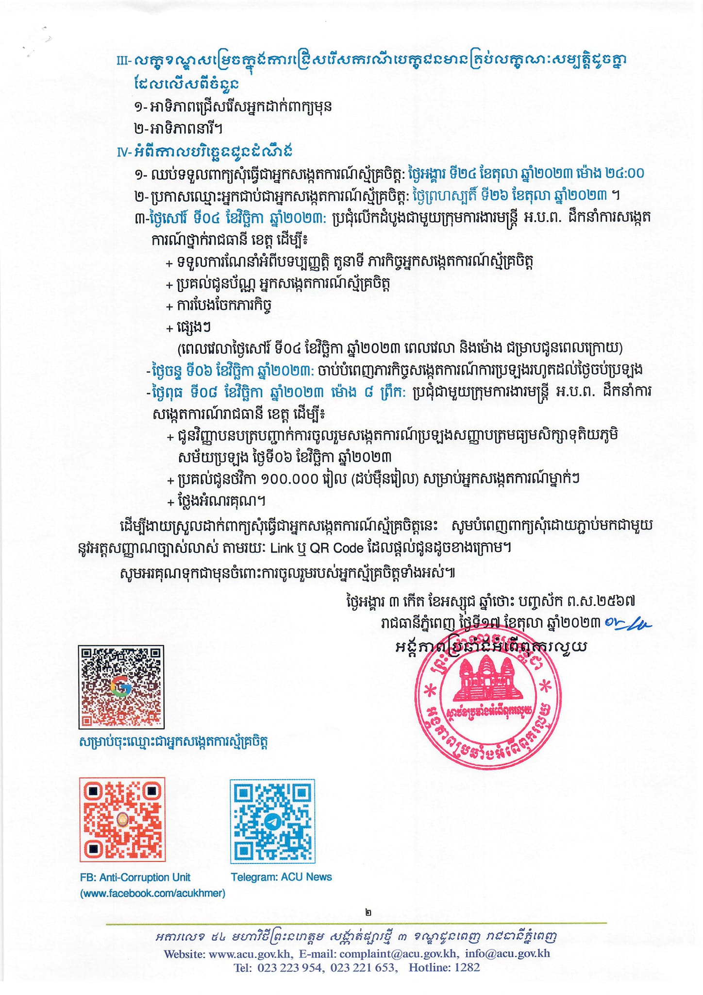 រាជធានីភ្នំពេញ៖ នៅថ្ងៃទី១៨ ខែតុលា ឆ្នាំ២០២៣ យោងតាមការចុះផ្សាយរបស់ អង្គភាពប្រឆាំងអំពើពុករលួយ បានចេញសេចក្តីជូនដំណឹង ស្ដីពីការជ្រើសរើសអ្នកសង្កេតការណ៍ស្ម័គ្រចិត្ត សម្រាប់ការសង្កេតការណ៍ ប្រឡងសញ្ញាបត្រមធ្យមសិក្សាទុតិយភូមិ សម័យប្រឡង៖ ថ្ងៃទី៦ ខែវិច្ឆិកា ឆ្នាំ២០២៣ សរុបចំនួន ៣.០៤០នាក់ ។