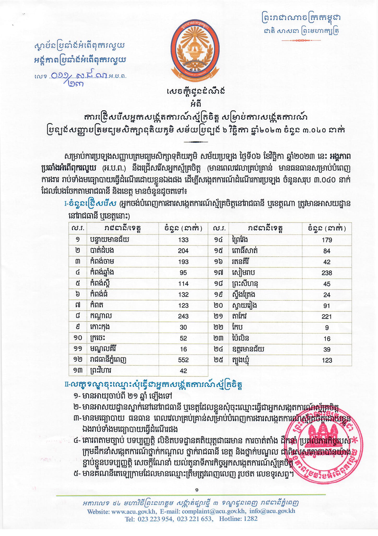 សម្រាប់ការប្រឡងសញ្ញាបត្រមធ្យមសិក្សាទុតិយភូមិ សម័យប្រឡង ថ្ងៃទី០៦ ខែវិច្ឆិកា ឆ្នាំ២០២៣នេះ អង្គភាពប្រឆាំងអំពើពុករលួយ (អ.ប.ព.) នឹងជ្រើសរើសអ្នកស្ម័គ្រចិត្ត (មានពេលវេលាគ្រប់គ្រាន់ មានធនធានសម្រាប់បំពេញ ការងារ រាប់ទាំងមធ្យោបាយធ្វើដំណើរដោយខ្លួនឯងផង ដើម្បីសង្កេតការណ៍ដំណើរការប្រឡង ចំនួនសរុប ៣.០៤០ នាក់។