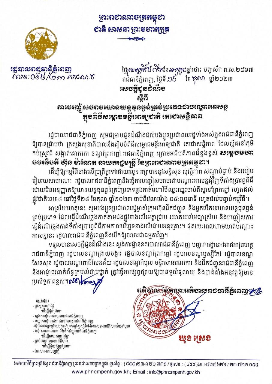 អាស្រ័យហេតុនេះ សូមបងប្អូនប្រជាពលរដ្ឋម្ចាស់ក្រុមហ៊ុនដឹកជញ្ជូន និងអ្នកបើកបរយានយន្តធុនធ្ងន់ គ្រប់ប្រភេទ ដែលធ្វើដំណើរឆ្លងកាត់តាមដងផ្លូវខាងលើមេត្តាជ្រាប យោគយល់អធ្យាស្រ័យ និងបញ្ចៀសការ ធ្វើដំណើរឆ្លងកាត់ទីតាំងប្រារព្ធពិធីតាមកាលបរិច្ឆេទខាងលើដោយអនុគ្រោះ។