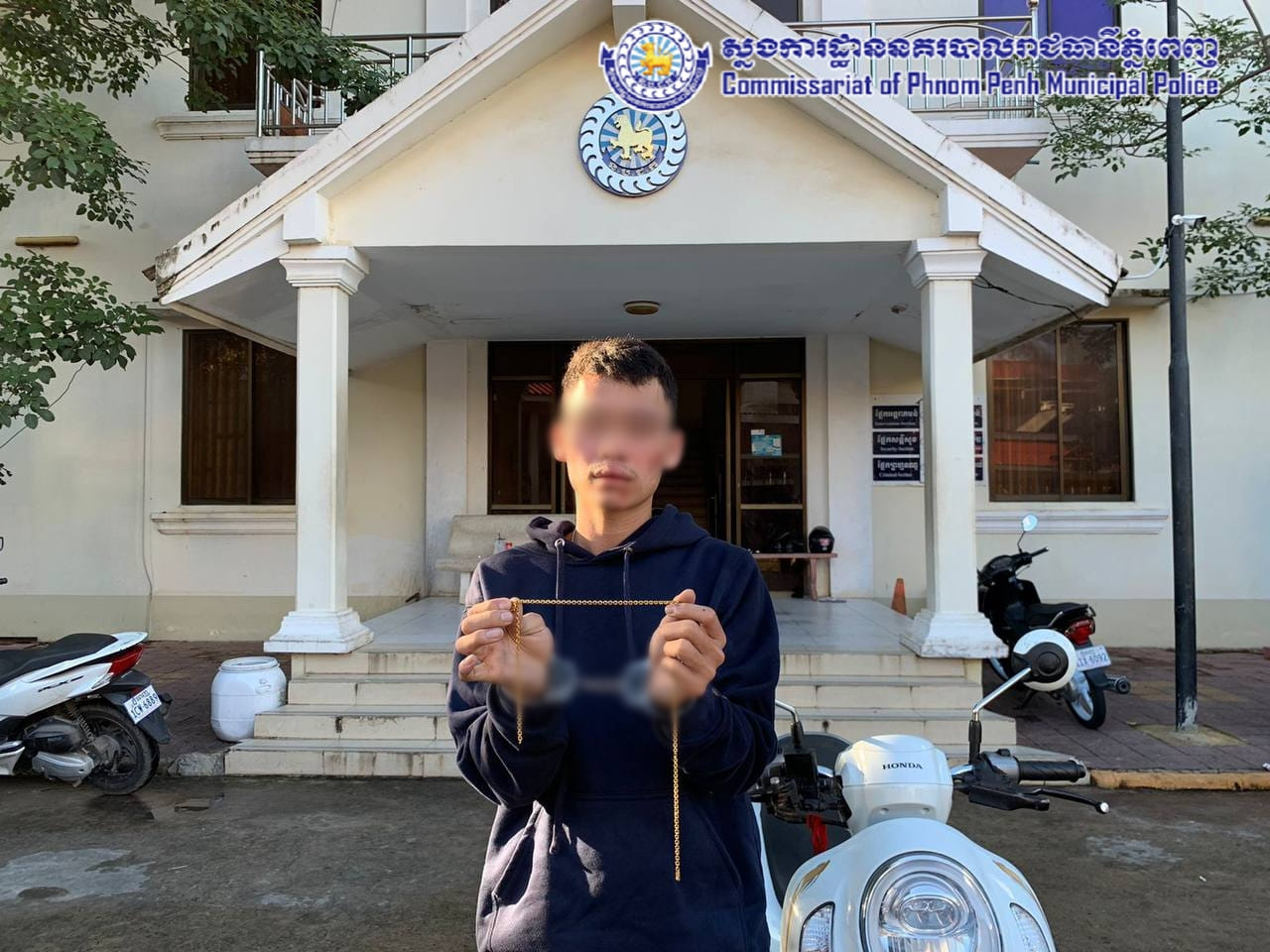 ជនសង្ស័យឈ្មោះ សុខា សុវណ្ណមុន្នីឆេង ហៅ ឆេង ភេទប្រុស ជនជាតិខ្មែរ មុខរបរ មិនពិតប្រាកដ ស្នាក់នៅមិនពិតប្រាកដ (មានសារធាតុញៀន)។ វត្ថុតាងចាប់យក៖ ម៉ូតូម៉ាក Honda Scoopy ស៊េរី២០២២ ពណ៌ស ពាក់ផ្លាកលេខ ភ្នំពេញ 1JN-3771 ជារបស់ជនសង្ស័យជិះធ្វើសកម្មភាព និងខ្សែកមាស១ខ្សែ ទម្ងន់៥ជី ជារបស់ជនរងគ្រោះ។ បន្ទាប់មកសមត្ថកិច្ចបានប្រគល់ជូនជនរងគ្រោះវិញតាមការស្នើសុំ។