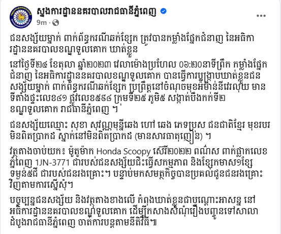 រាជធានីភ្នំពេញ៖ យោងតាមការចុះផ្សាយរបស់ ស្នងការដ្ឋាននគរបាលរាជធានីភ្នំពេញ បានឱ្យដឹងថា នៅថ្ងៃទី២៤ ខែតុលា ឆ្នាំ២០២៣ វេលាម៉ោងប្រហែល ០៦៖២០នាទីព្រឹក កម្លាំងផ្នែកជំនាញ នៃអធិការដ្ឋាននគរបាលខណ្ឌទួលគោក បានធ្វើការបង្ក្រាបឃាត់ខ្លួនជនសង្ស័យម្នាក់ ពាក់ព័ន្ធករណីឆក់ខ្សែក ប្រព្រឹត្តនៅចំណុចមុខអ៉ីម៉ាន់នីវេរលុយ មានទីតាំងផ្ទះលេខ៨១ ផ្លូវលេខ៥៩៨ ក្រុមទី២៥ ភូមិ៥ សង្កាត់បឹងកក់ទី២ ខណ្ឌទួលគោក រាជធានីភ្នំពេញ។