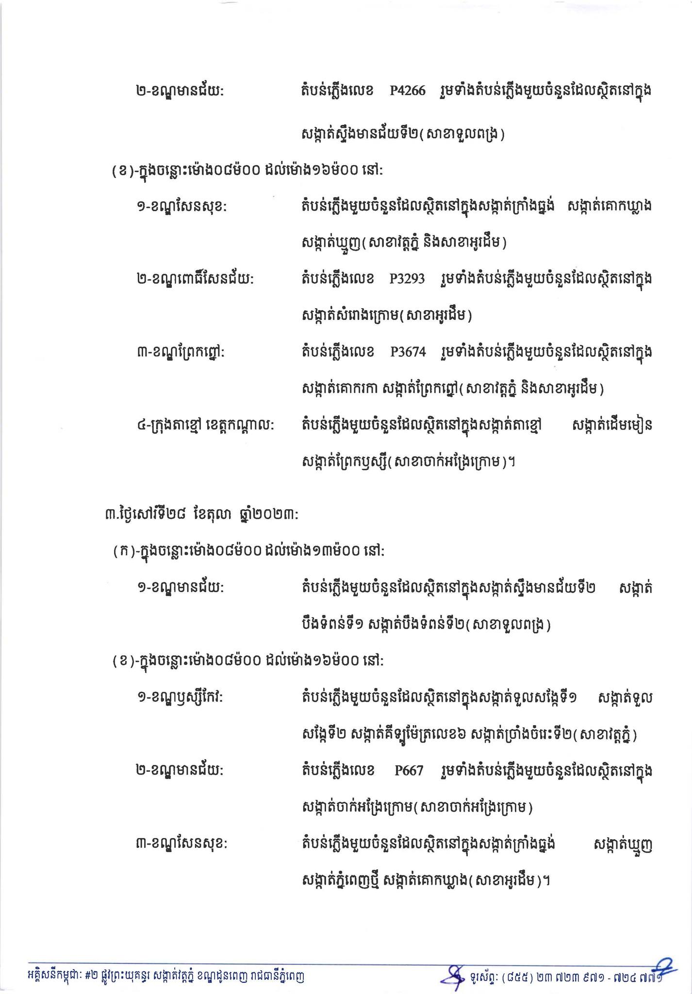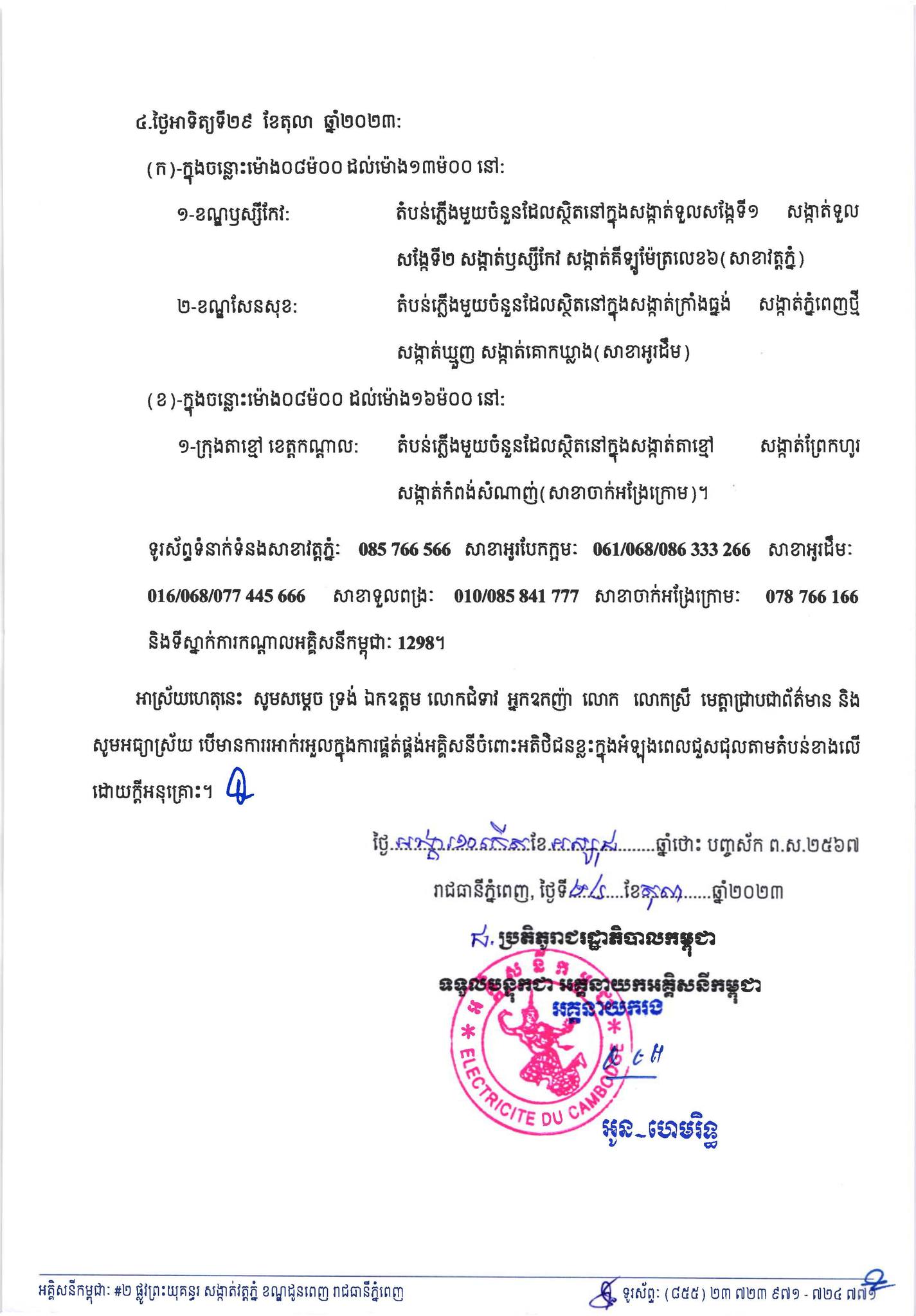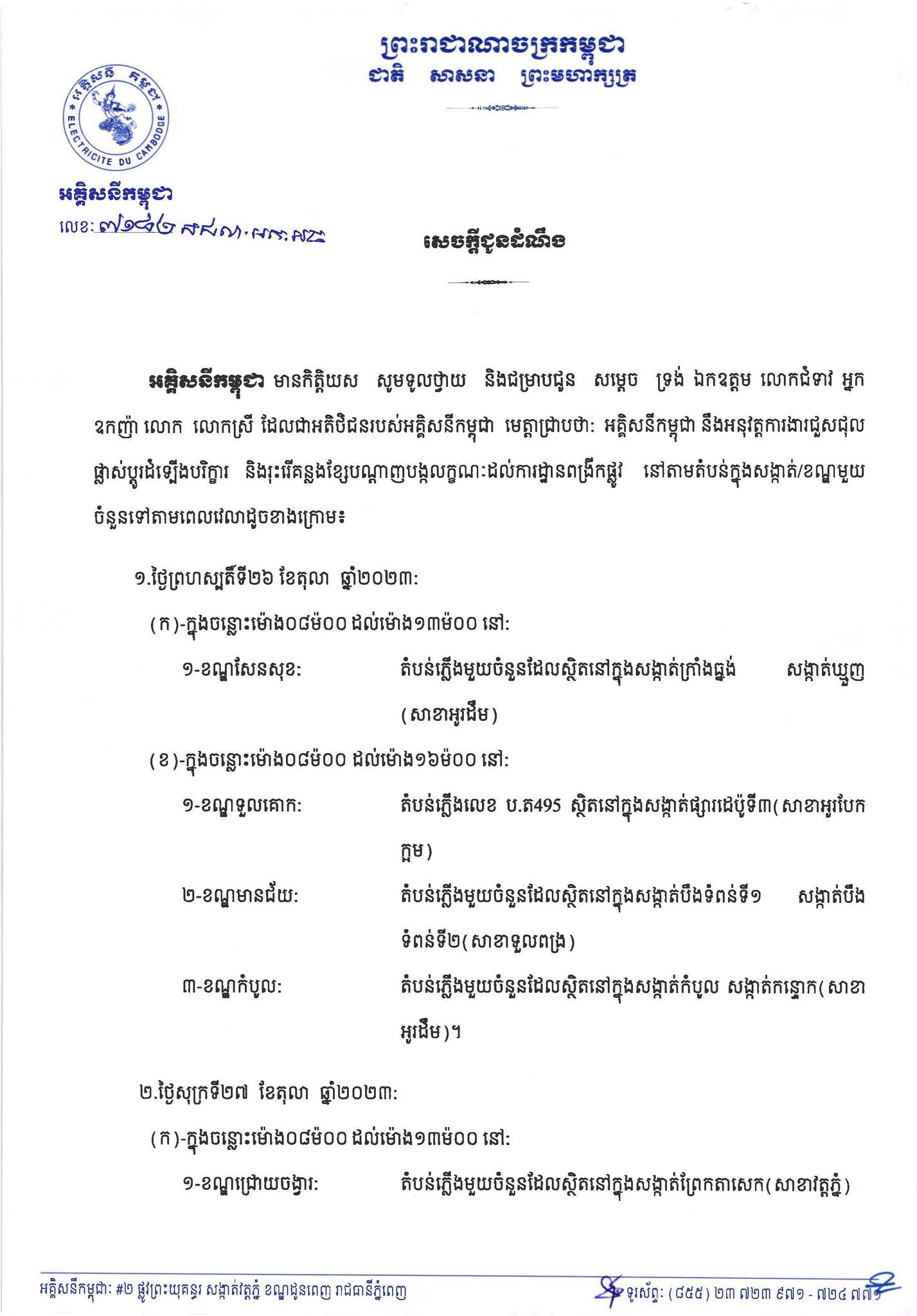 រាជធានីភ្នំពេញ៖ នៅថ្ងៃពុធ ១១កើត ខែអស្សុជ ឆ្នាំថោះ បញ្ចស័ក ព.ស.២៥៦៧ ត្រូវនឹងថ្ងៃទី២៥ ខែតុលា ឆ្នាំ២០២៣ យោងតាមការចុះផ្សាយរបស់ អគ្គិសនីកម្ពុជា បានចេញសេចក្តីជូនដំណឹងស្តីពីការអនុវត្តការងារជួសជុល ផ្លាស់ប្តូរដំឡើងបរិក្ខារនានា និងរុះរើគន្លងខ្សែបណ្តាញអគ្គិសនីរបស់អគ្គិសនីកម្ពុជា ដើម្បីបង្កលក្ខណៈងាយស្រួលដល់ការដ្ឋានពង្រីកផ្លូវ នៅថ្ងៃទី២៦ ខែតុលា ឆ្នាំ២០២៣ ដល់ថ្ងៃទី២៩ ខែតុលា ឆ្នាំ២០២៣ នៅតំបន់មួយចំនួនទៅតាមពេលវេលា និងទីកន្លែងដូចសេចក្តីជូនដំណឹងលម្អិតខាងក្រោម។