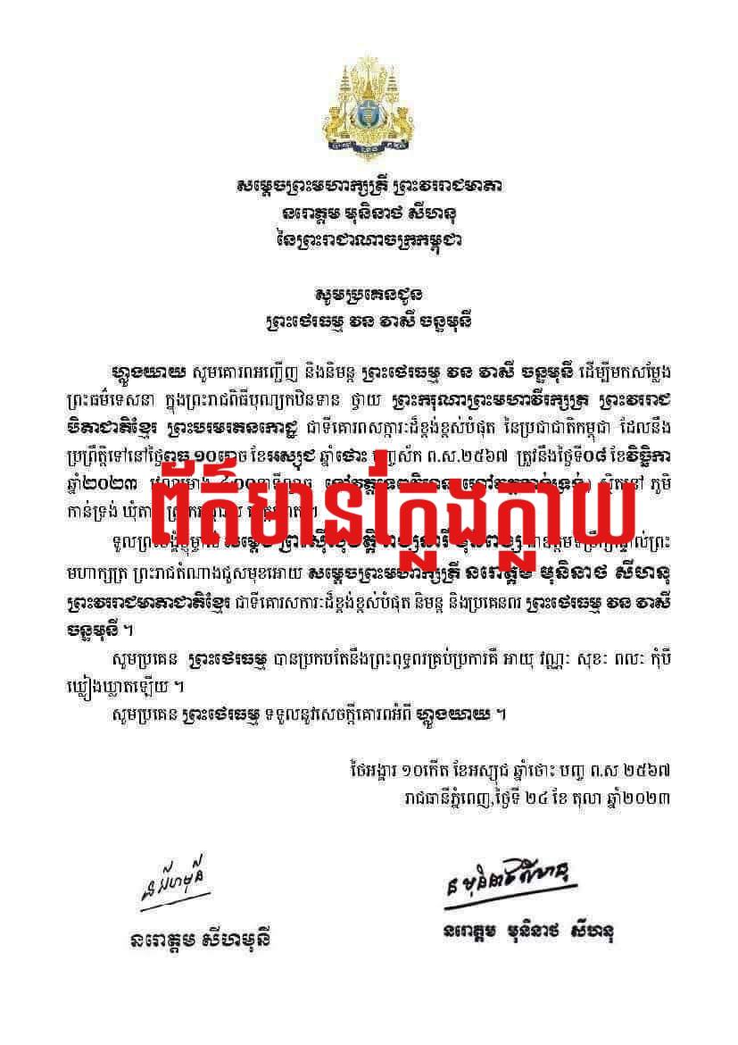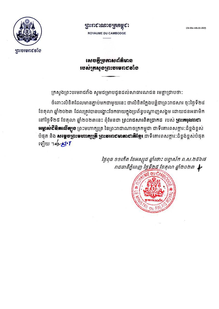 ក្រសួងព្រះបរមរាជវាំង សូមជម្រាបជូនដល់សាធារណជន មេត្តាជ្រាបថា ចំពោះលិខិតដែលមានភ្ជាប់មកជាមួយនេះ ជាលិខិតក្លែងបន្លំជាព្រះរាជសារ ចុះថ្ងៃទី២៤ ខែតុលា ឆ្នាំ២០២៣ ដែលត្រូវបានបង្ហោះចែកចាយក្នុងប្រព័ន្ធបណ្តាញសង្គម ដោយជនអនាមិក នៅថ្ងៃទី២៥ ខែតុលា ឆ្នាំ២០២៣នេះ ពុំមែនជាព្រះរាជសារពិតប្រាកដ របស់ ព្រះករុណាជាអម្ចាស់ជីវិតលើត្បូង ព្រះមហាក្សត្រ នៃព្រះរាជាណាចក្រកម្ពុជា ជាទីគោរពសក្ការៈដ៏ខ្ពង់ខ្ពស់បំផុត និង សម្ដេចព្រះមហាក្សត្រី ព្រះវររាជមាតាជាតិខ្មែរ ជាទីគោរពសក្ការៈដ៏ខ្ពង់ខ្ពស់បំផុត ឡើយ ។
