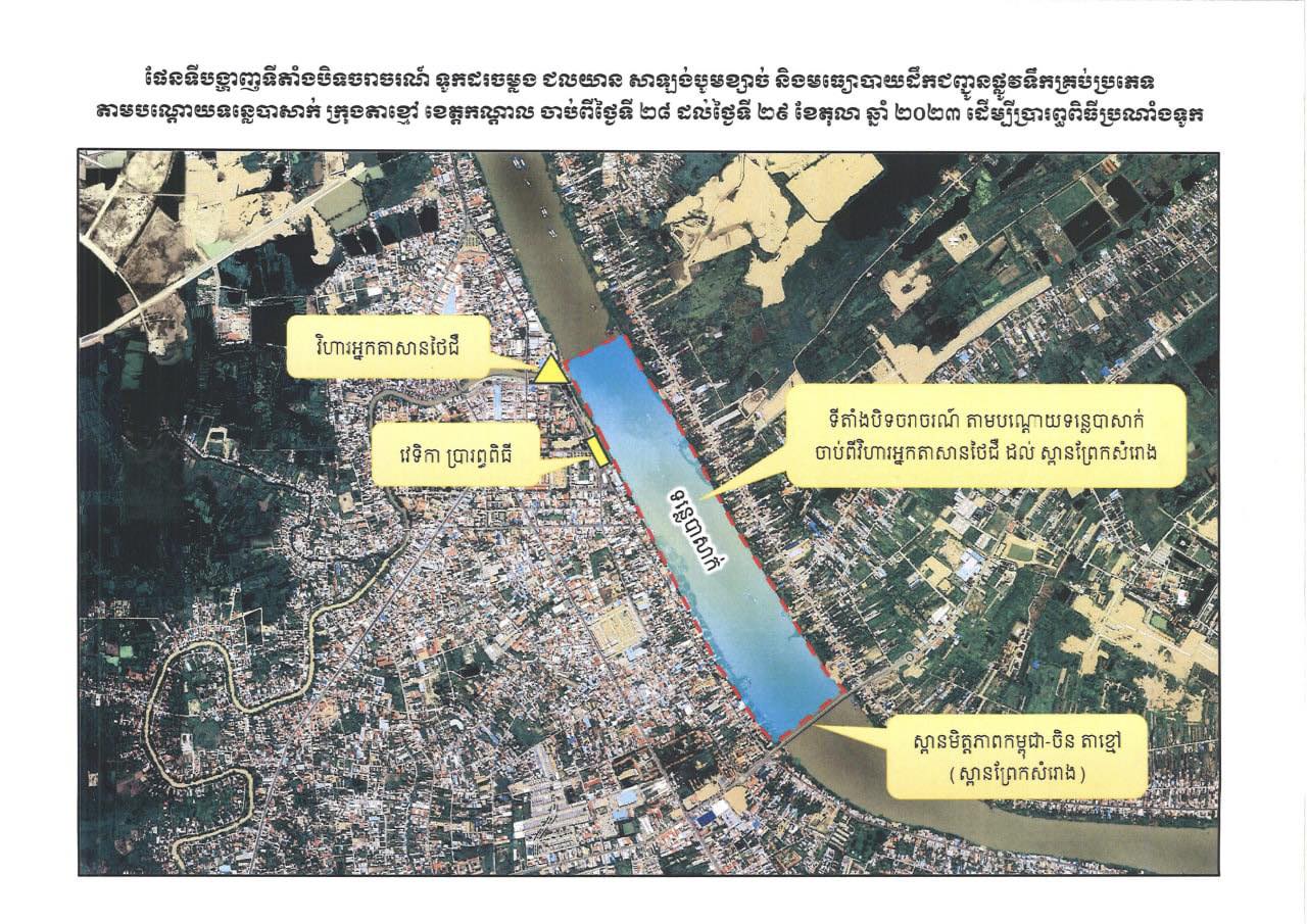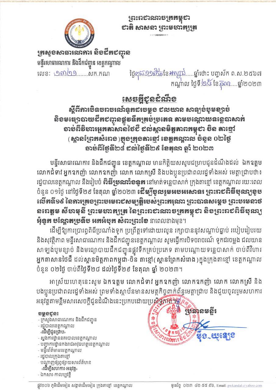 ដើម្បីឱ្យការប្រារព្ធពិធីប្រណាំងទូក ប្រព្រឹត្តទៅដោយរលូន រក្សាបាននូវសណ្តាប់ធ្នាប់ របៀបរៀបរយ និងសុវត្ថិភាព មន្ទីរសាធារណការ និងដឹកជញ្ជូនខេត្តកណ្តាល សូមធ្វើការបិទចរាចរណ៍ ទូកដរចម្លង ជលយាន សាឡង់បូមខ្សាច់ និងមធ្យោបាយដឹកជញ្ជូនផ្លូវទឹកគ្រប់ប្រភេទ តាមបណ្ដោយទន្លេបាសាក់ ចាប់ពីវិហារអ្នកតាសានថៃជី ដល់ស្ពានមិត្តភាពកម្ពុជា-ចិន តាខ្មៅ(ស្ពានព្រែកសំរោង) ក្នុងក្រុងតាខ្មៅ ខេត្តកណ្តាលចំនួន ០២ថ្ងៃ ចាប់ពីថ្ងៃទី២៨ ដល់ថ្ងៃទី២៩ ខែតុលា ឆ្នាំ ២០២៣ ៕