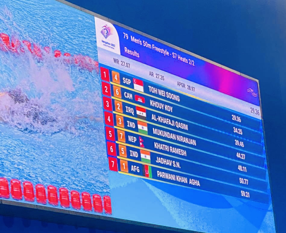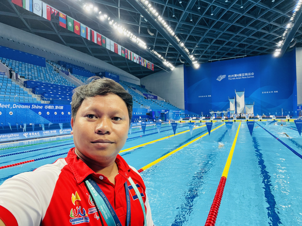 កីឡាករហែលទឹករបស់កម្ពុជាតែម្នាក់គត់ ដែលលេងលើ២វិញ្ញាសារូបនេះបានបញ្ចប់លើវិញ្ញាសាទី១របស់ខ្លួន កាលពីល្ងាចថ្ងៃទី២៦ ខែតុលា ម្សិលមិញ គឺវិញ្ញាសាហែល ១០០ម៉ែត្រកង្កែប កម្រិតពិការ SB6 ដោយទទួលបានចំណាត់ថ្នាក់លេខ៥ ក្នុងវគ្គផ្តាច់ព្រ័ត្រ ដោយមិនទទួលបានមេដាយនោះទេ ខណៈចំណាត់លេខ១ លេខ២ និងលេខ៣ បានទៅម្ចាស់ផ្ទះចិនទាំង៣នាក់។