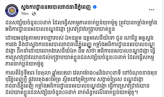 រាជធានីភ្នំពេញ៖ នៅថ្ងៃទី២៧ ខែតុលា ឆ្នាំ២០២៣ យោងតាមការចុះផ្សាយរបស់ ស្នងការដ្ឋាននគរបាលរាជធានីភ្នំពេញ បានឱ្យដឹងថា ដោយអនុវត្តតាមបទបញ្ជារបស់ ឯកឧត្តម ឧត្តមសេនីយ៍ទោ ជួន ណារិន្ទ អគ្គស្នងការរង និងជាស្នងការនគរបាលរាជធានីភ្នំពេញ កម្លាំងអធិការដ្ឋាននគរបាលខណ្ឌដង្កោ ដឹកនាំដោយលោកវរសេនីយ៍ឯក ជឹម ស៉ីថា អធិការនគរបាលខណ្ឌដង្កោ ធ្វើការស្រាវជ្រាវឈានដល់បង្ក្រាបឃាត់ខ្លួនជនសង្ស័យចំនួន០៦នាក់ ដែលធ្វើសកម្មភាពធាក់ប្លន់យកម៉ូតូ កាលពីថ្ងៃទី២៧ ខែតុលា ឆ្នាំ២០២៣ វេលាម៉ោង០៤និង៣០នាទី នៅចំណុចខាងមុខបុរីភ្នំពេញថ្មី ផ្លូវបេតុង៥០ម៉ែត្រ ស្ថិតនៅភូមិប្រការ សង្កាត់ព្រៃស ខណ្ឌដង្កោ រាជធានីភ្នំពេញ កម្លាំងអធិការដ្ឋាននគរបាលខណ្ឌដង្កោ ធ្វើការស្រាវជ្រាវឈានដល់ឃាត់ខ្លួនជនសង្ស័យចំនួន០៦នាក់ ពាក់ព័ន្ធករណីធាក់ប្លន់យកម៉ូតូ។