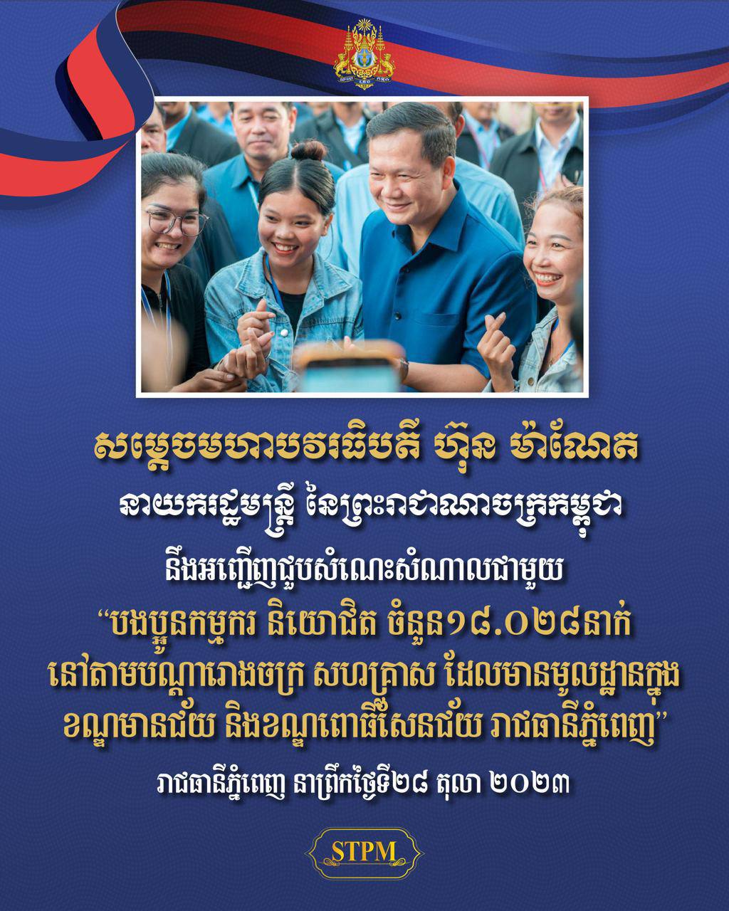 ព្រឹកស្អែកសម្តេចធិបតី ហ៊ុន ម៉ាណែត នឹងជួបសំណេះសំណាលជាមួយបងប្អូនកម្មករនិយោជិតចំនួន ១៨.០២៨នាក់ នៅរាជធានីភ្នំពេញ