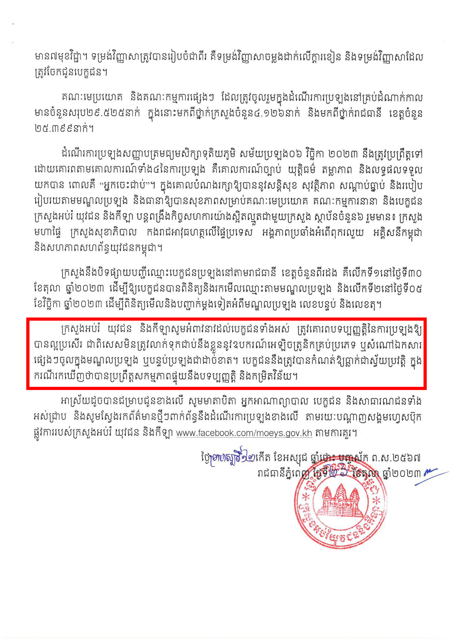 ក្រសួងអប់រំ យុវជន និងកីឡា សូមអំពាវនាវដល់បេក្ខជនទាំងអស់ ត្រូវគោរពបទប្បញ្ញត្តិនៃការប្រឡងឱ្យ បានល្អប្រសើរ ជាពិសេសមិនត្រូវលាក់ទុកជាប់នឹងខ្លួននូវឧបករណ៍អេឡិចត្រូនិកគ្រប់ប្រភេទ ឬសំណៅឯកសារ ផ្សេងៗចូលក្នុងមណ្ឌលប្រឡង ឬបន្ទប់ប្រឡងជាដាច់ខាត។ បេក្ខជននឹងត្រូវបានកំណត់ឱ្យធ្លាក់ជាស្វ័យប្រវត្តិ ក្នុង ករណីរកឃើញថាបានប្រព្រឹត្តសកម្មភាពផ្ទុយនឹងបទប្បញ្ញត្តិ និងកម្រិតវិន័យ។