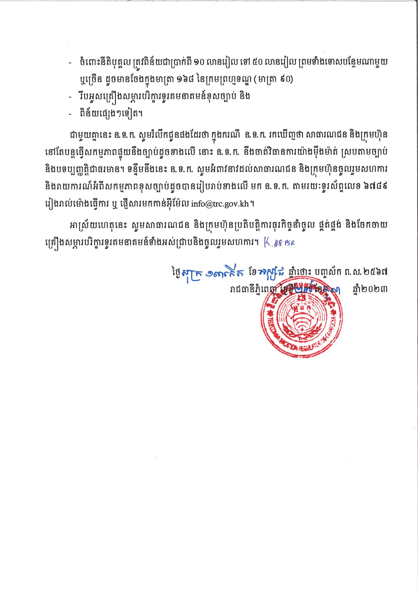 ជាមួយគ្នានេះ ន.ទ.ក. សូមរំលឹកជូនផងដែរថា ក្នុងករណី ន.ទ.ក. រកឃើញថា សាធារណជន និងក្រុមហ៊ុននៅតែបន្តធ្វើសកម្មភាពផ្ទុយនឹងច្បាប់ដូចខាងលើ នោះ ន.ទ.ក. នឹងចាត់វិធានការ យ៉ាងម៉ឺងម៉ាត់ ស្របតាមច្បាប់និងបទប្បញ្ញត្តិជាធរមាន។ ទន្ទឹមនឹងនេះ ន.ទ.ក. សូមអំពាវនាវដល់សាធារណជន និងក្រុមហ៊ុនចូលរួមសហការ និងរាយការណ៍អំពីសកម្មភាពខុសច្បាប់ ដូចបាន រៀបរាប់ខាងលើ មក ន.ទ.ក. តាមរយៈទូរស័ព្ទលេខ ៦៧៨៩ រៀងរាល់ម៉ោងធ្វើការ ឬ ផ្ញើសារ មកកាន់អ៊ីម៉ែល info@trc.gov.kh៕