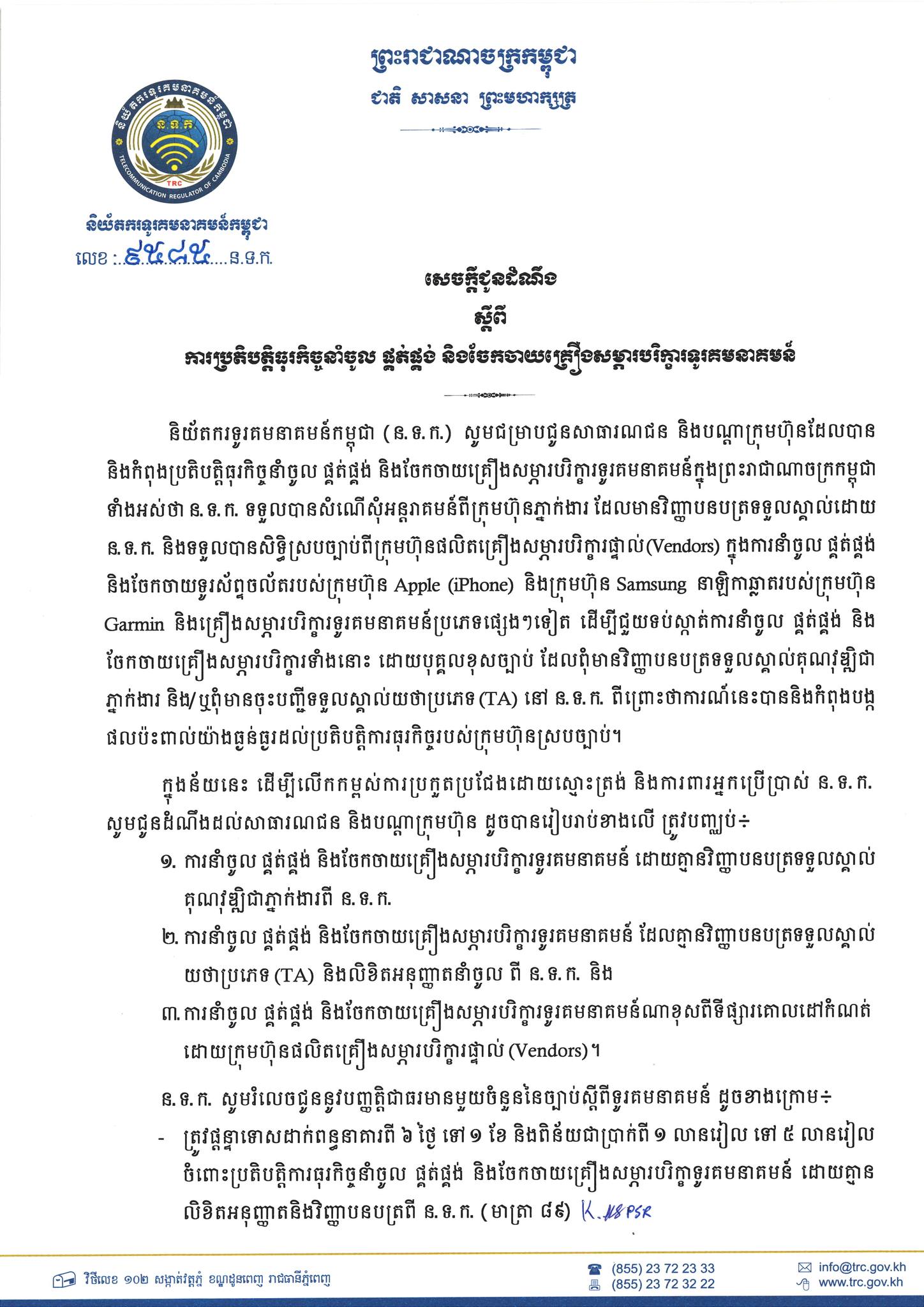និយ័តករទូរគមនាគមន៍កម្ពុជា (ន.ទ.ក.) សូមជម្រាបជូនសាធារណជនឱ្យបានជ្រាបថា ទទួលបានសំណើសុំអន្តរាគមន៍ពីក្រុមហ៊ុនភ្នាក់ងារ ដែលមានវិញ្ញាបនបត្រទទួលស្គាល់ដោយ ន.ទ.ក. និងទទួលបានសិទ្ធិស្របច្បាប់ ពីក្រុមហ៊ុនផលិតគ្រឿងសម្ភារបរិក្ខារផ្ទាល់ (Vendors) ក្នុងការនាំចូល ផ្គត់ផ្គង់ និងចែកចាយទូរស័ព្ទចល័តរបស់ក្រុមហ៊ុន Apple (iPhone) និងក្រុមហ៊ុន Samsung នាឡិកាឆ្លាតរបស់ក្រុមហ៊ុន Garmin និងគ្រឿងសម្ភារបរិក្ខារទូរគមនាគមន៍ប្រភេទផ្សេងៗទៀត ដើម្បីជួយទប់ស្កាត់ការនាំចូល ផ្គត់ផ្គង់ និងចែកចាយគ្រឿងសម្ភារបរិក្ខារទាំងនោះ ដោយបុគ្គលខុសច្បាប់ ដែលពុំមានវិញ្ញាបនបត្រទទួលស្គាល់ គុណវុឌ្ឍិជាភ្នាក់ងារ និង/ឬពុំមានចុះបញ្ជីទទួលស្គាល់យថាប្រភេទ (TA) នៅ ន.ទ.ក. ពីព្រោះថាការណ៍នេះបាននិងកំពុងបង្កផលប៉ះពាល់យ៉ាងធ្ងន់ធ្ងរ ដល់ប្រតិបត្តិការធុរកិច្ចរបស់ក្រុមហ៊ុនស្របច្បាប់។
