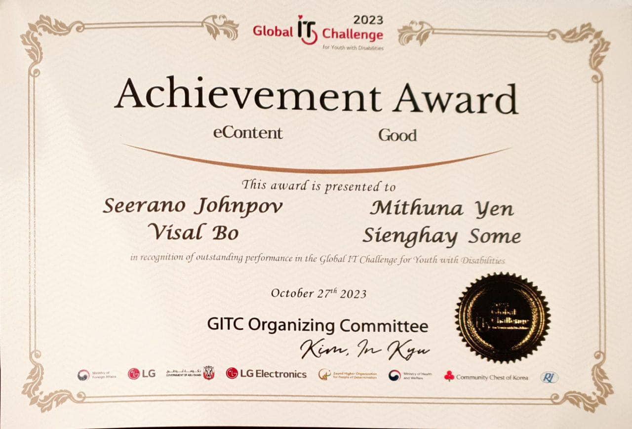 បានបន្ថែមទៀតដែរថា យុវជនមានពិការភាពកម្ពុជាបានទទួលមេដាយមាសក្នុងការប្រកួតជាសាកលផ្នែកព័ត៌មានវិទ្យាឆ្នាំ២០២៣ (Global IT Challenge for Youth with Disability 2023)។
