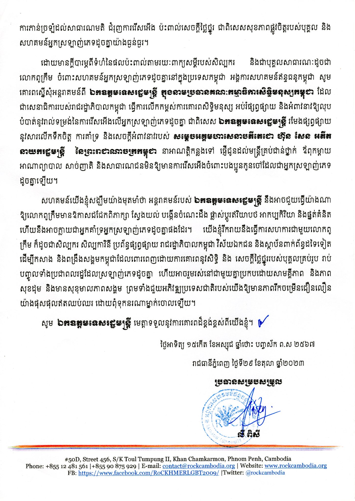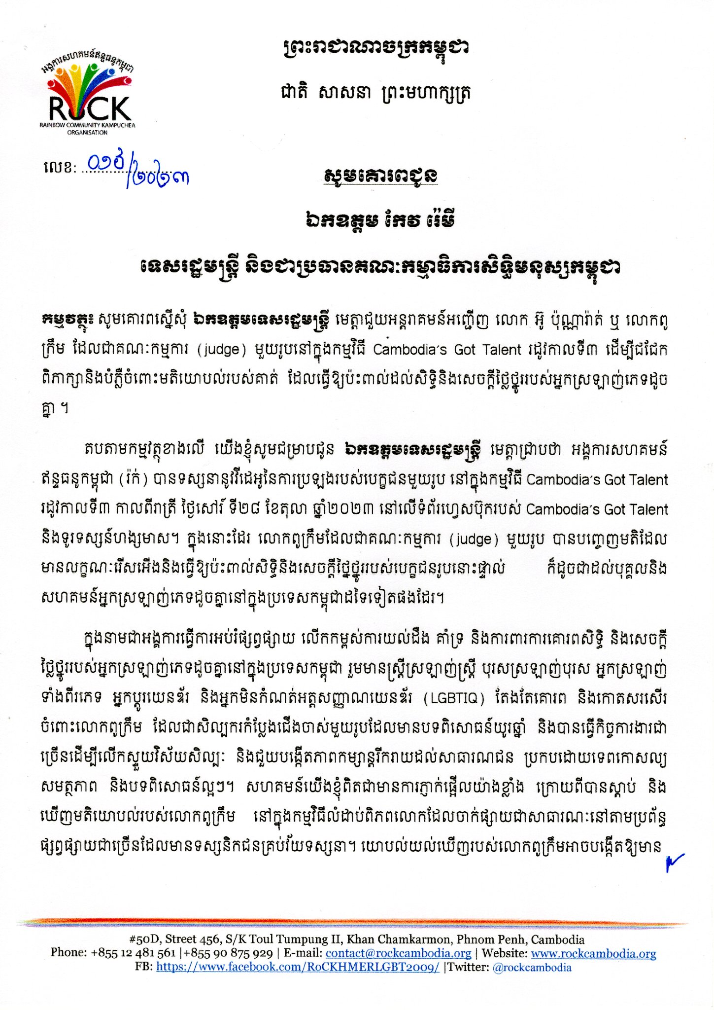 ដោយមានក្តីបារម្ភពីទំហំនៃផលប៉ះពាល់តាមរយៈពាក្យសម្តីរបស់សិល្បករ និងជាបុគ្គលសាធារណៈដូចជា លោកពូក្រឹម ចំពោះសហគមន៍អ្នកស្រឡាញ់ភេទដូចគ្នានៅក្នុងប្រទេសកម្ពុជា អង្គការសហគមន៍ឥន្ទធនូកម្ពុជា សូមគោរពស្នើសុំអន្តរាគមន៍ពី ឯកឧត្តមទេសរដ្ឋមន្ដ្រី ក្នុងនាមប្រធានគណៈកម្មាធិការសិទ្ធិមនុស្សកម្ពុជា ដែលជាសេនាធិការរបស់រាជរដ្ឋាភិបាលកម្ពុជា ធ្វើការលើកកម្ពស់ការគោរពសិទ្ធិមនុស្ស អប់រំផ្សព្វផ្សាយ និងអំពាវនាវឱ្យលុបបំបាត់នូវរាល់ទម្រង់នៃការរើសអើងលើអ្នកស្រឡាញ់ភេទដូចគ្នា ជាពិសេស ឯកឧត្ដមទេសរដ្ឋមន្ត្រី រមែងផ្សព្វផ្សាយ នូវសារលើកទឹកចិត្ត ការគាំទ្រ និងសេចក្តីអំពាវនាវរបស់ សម្តេចអគ្គមហាសេនាបតីតេជោ ហ៊ុន សែន អតីត នាយករដ្ឋមន្ត្រី នៃព្រះរាជាណាចក្រកម្ពុជា នាអាណត្តិកន្លងទៅ ផ្ញើជូនដល់មន្ត្រីគ្រប់ជាន់ថ្នាក់ ឪពុកម្ដាយ អាណាព្យាបាល សាច់ញាតិ និងសាធារណជនមិនឱ្យមានការរើសអើងចំពោះបងប្អូនកូនចៅដែលជាអ្នកស្រឡាញ់ភេទ ដូចគ្នាឡើយ។