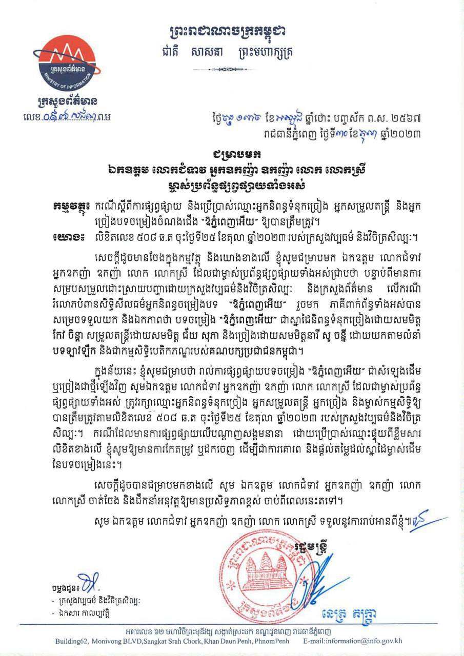 ក្នុងន័យនេះ ខ្ញុំសូមជម្រាបថា រាល់ការផ្សព្វផ្សាយបទចម្រៀង “ឱភ្នំពេញអើយ” ជាសំឡេងដើម ឬច្រៀងជាថ្មីឡើងវិញ សូមឯកឧត្តម លោកជំទាវ អ្នកឧកញ៉ា ឧកញ៉ា លោក លោកស្រី ដែលជាម្ចាស់ប្រព័ន្ធ ផ្សព្វផ្សាយទាំងអស់ ត្រូវរក្សាឈ្មោះអ្នកនិពន្ធទំនុកច្រៀង អ្នកសម្រួលតន្រ្តី អ្នកច្រៀង និងម្ចាស់កម្មសិទ្ធិឱ្យបានត្រឹមត្រូវតាមលិខិតលេខ ៥០៨ ឆ.ត ចុះថ្ងៃទី២៥ ខែតុលា ឆ្នាំ២០២៣ របស់ក្រសួងវប្បធម៌និងវិចិត្រ សិល្បៈ។ ករណីដែលមានការផ្សព្វផ្សាយលើបណ្តាញសង្គមនានា ដោយប្រើប្រាស់ឈ្មោះផ្ទុយពីខ្លឹមសារ លិខិតខាងលើ ខ្ញុំសូមឱ្យមានការកែតម្រូវ ឬដកចេញ ដើម្បីជាការគោរព និងផ្ដល់តម្លៃដល់ស្នាដៃម្ចាស់ដើម នៃបទចម្រៀងនេះ ៕
