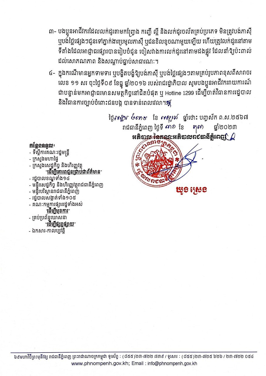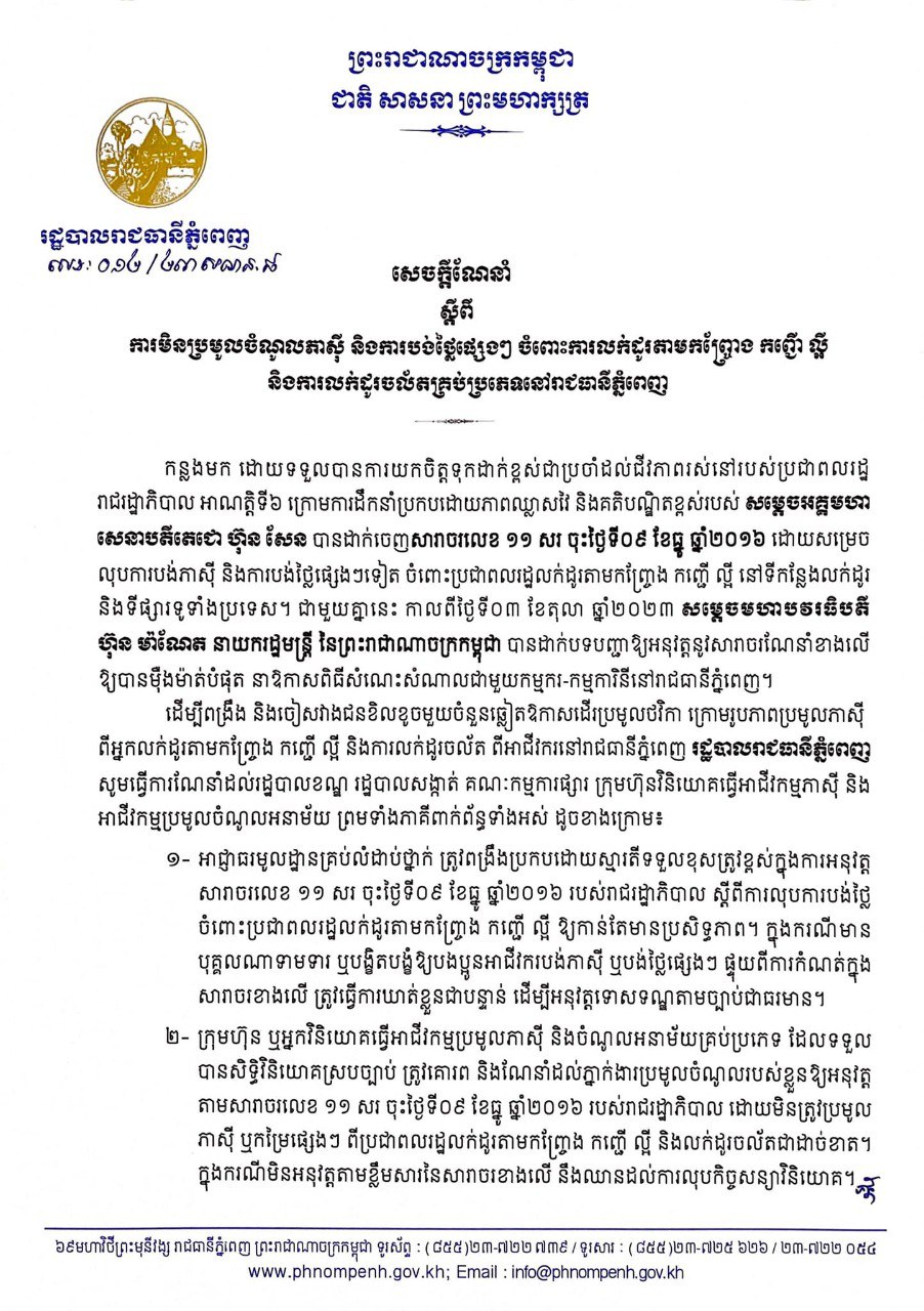 ដើម្បីពង្រឹង និងចៀសវាងជនខិលខូចមួយចំនួនឆ្លៀតឱកាសដើរប្រមូលថវិកា ក្រោមរូបភាពប្រមូលភាស៊ី ពីអ្នកលក់ដូរតាមកញ្ច្រែង កញ្ជើ ល្អី និងការលក់ដូរចល័ត ពីអាជីវករនៅរាជធានីភ្នំពេញ រដ្ឋបាលរាជធានីភ្នំពេញ សូមធ្វើការណែនាំដល់រដ្ឋបាលខណ្ឌ រដ្ឋបាលសង្កាត់ គណៈកម្មការផ្សារ ក្រុមហ៊ុនវិនិយោគធ្វើអាជីវកម្មភាស៊ី និង អាជីវកម្មប្រមូលចំណូលអនាម័យ ព្រមទាំងភាគីពាក់ព័ន្ធទាំងអស់ ដូចខាងក្រោម៖