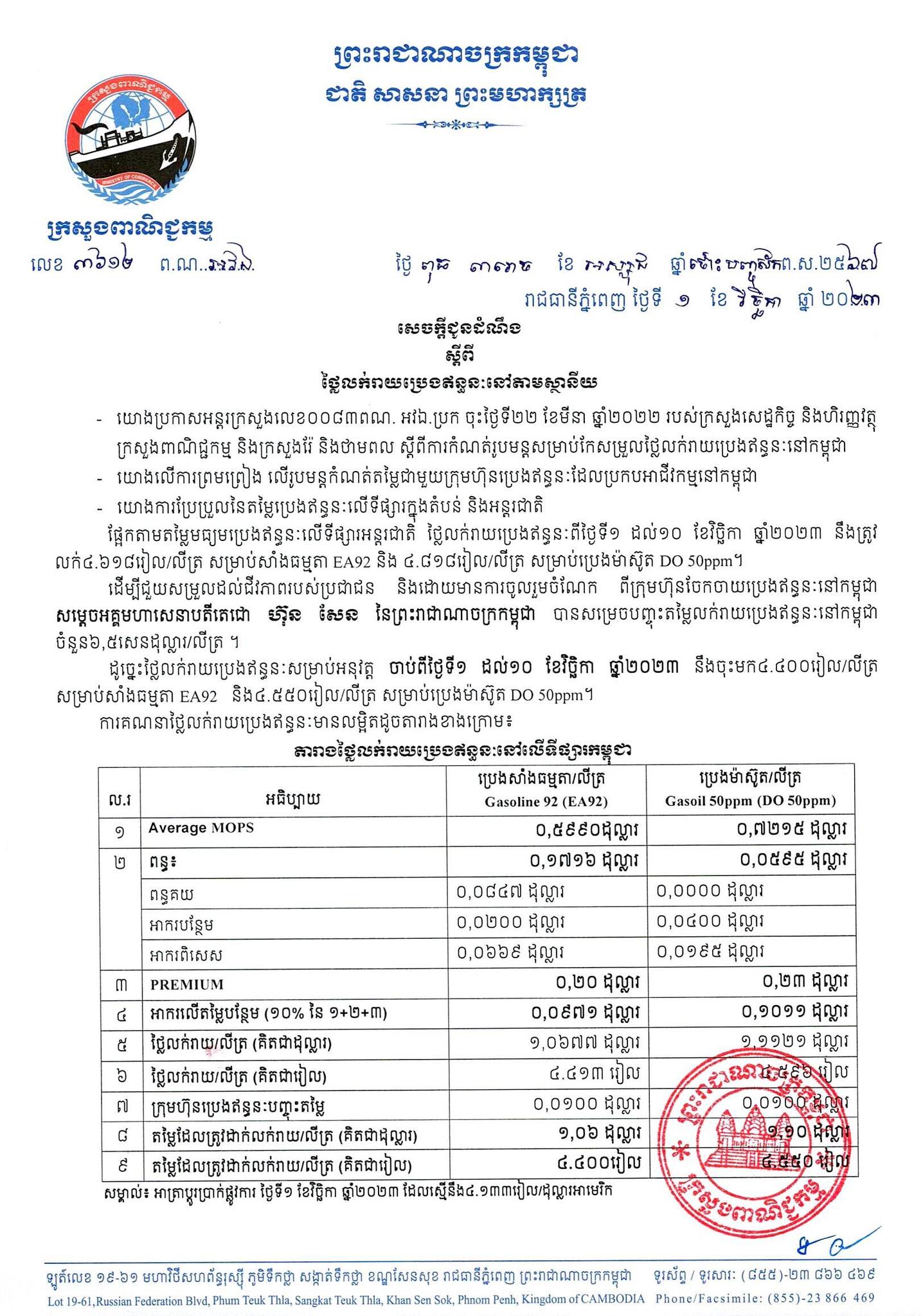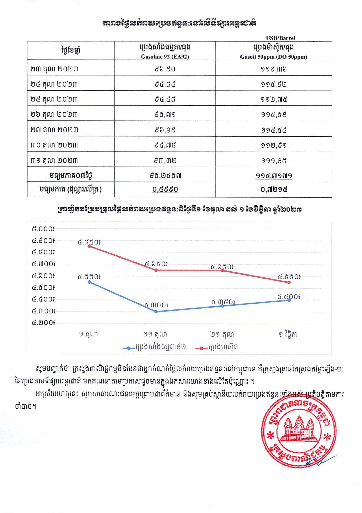 រាជធានីភ្នំពេញ៖ យោងតាមលិខិតរបស់ ក្រសួងពាណិជ្ជកម្ម ចុះផ្សាយថ្ងៃទី០១ ខែវិច្ឆិកា ឆ្នាំ២០២៣ ស្តីអំពីតម្លៃលក់រាយប្រេងឥន្ធនៈនៅតាមស្ថានីយទាំងអស់ក្នុងព្រះរាជាណាចក្រកម្ពុជាសម្រាប់អនុវត្តទៅតាមតម្លៃមធ្យមប្រេងឥន្ធនៈលើទីផ្សារអន្តរជាតិ ចាប់ពីថ្ងៃទី០១ ដល់ថ្ងៃទី១០ ខែវិច្ឆិកា ឆ្នាំ២០២៣ បានឲ្យដឹងថា តម្លៃប្រេងសាំងធម្មតាមានតម្លៃ ៤,៤០០រៀលក្នុងមួយលីត្រ ចំណែកឯប្រេងសាំងម៉ាស៊ូតមានតម្លៃ ៤,៥៥០រៀលក្នុងមួយលីត្រប៉ុណ្ណោះ។