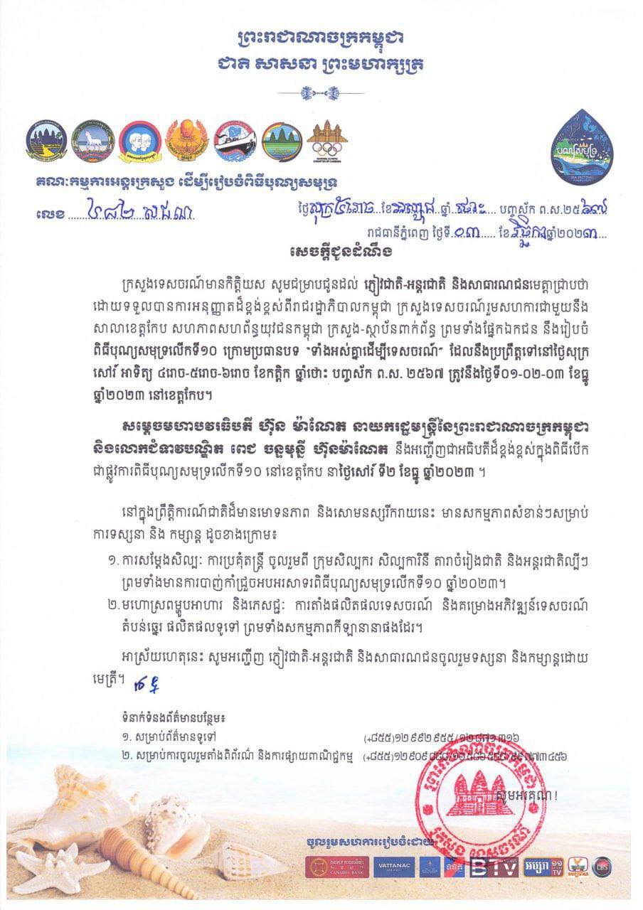 បន្ថែមផងដែរថា សម្ដេចមហាបវរធិបតី ហ៊ុន ម៉ាណែត នាយករដ្ឋមន្ដ្រីនៃព្រះរាជាណាចក្រកម្ពុជា និងលោកជំទាវបណ្ឌិត ពេជ ចន្ទមុន្នី ហ៊ុនម៉ាណែត នឹងអញ្ជើញជាអធិបតីដ៏ខ្ពង់ខ្ពស់ក្នុងពិធីបើកជាផ្លូវការពិធីបុណ្យសមុទ្រលើកទី១០ នៅខេត្តកែប នាថ្ងៃសៅរ៍ ទី២ ខែធ្នូ ឆ្នាំ២០២៣។