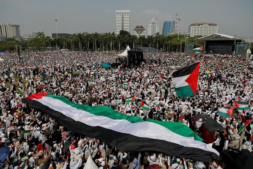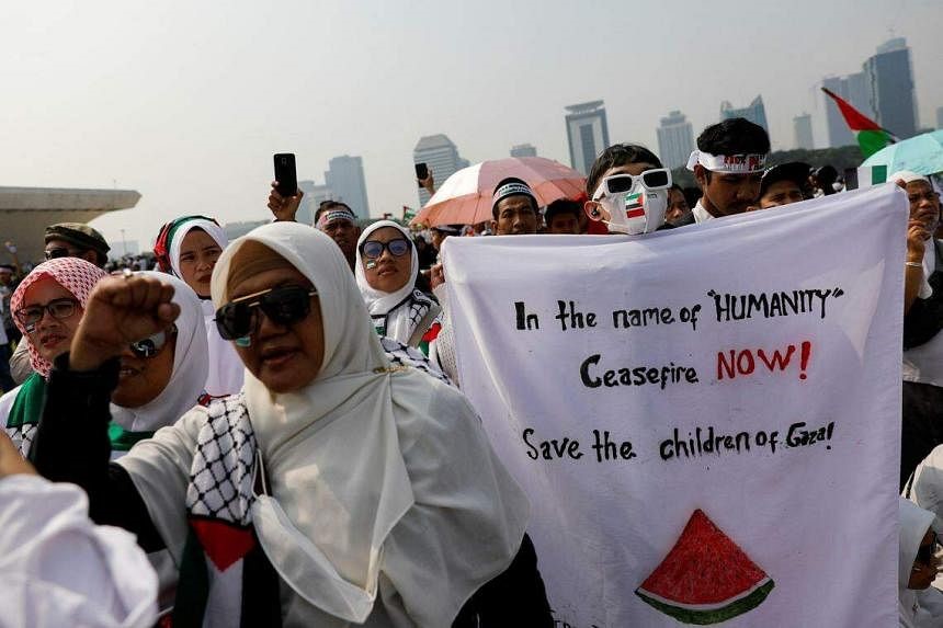 ឥណ្ឌូនេស៊ី៖ ពលរដ្ឋឥណ្ឌូនេស៊ីរាប់ម៉ឺននាក់បាននាំគ្នាធ្វើបាតុកម្មនៅក្នុងទីក្រុងចាតាកាដើម្បីបង្ហាញសាមគ្គីជាមួយពលរដ្ឋប៉ាឡេស្ទីនដែលកំពុងរងគ្រោះដោយការប្រយុទ្ធគ្នានៅតំបន់ហ្គាហ្សា នេះបើយោងតាមការចុះផ្សាយរបស់បណ្តាញសារព័ត៌មាន The Strait Time នៅក្នុងថ្ងៃអាទិត្យ ទី៥ ខែវិច្ឆិកានេះ។ ក្រុមពលរដ្ឋឥណ្ឌូនេស៊ីដែលសុទ្ធតែជាអ្នកកាន់សាសនាឥស្លាមទាំងអស់នោះត្រូវបានគេមើលឃើញថា បាននាំគ្នាពាក់អាវផាយពណ៌ស ទទូលកន្សែងប៉ាឡេស្ទីនពណ៌ស-ខ្មៅ និងថែមទាំងបានគ្រវីទង់ជាតិប៉ាឡេស្ទីនទៀតផង។