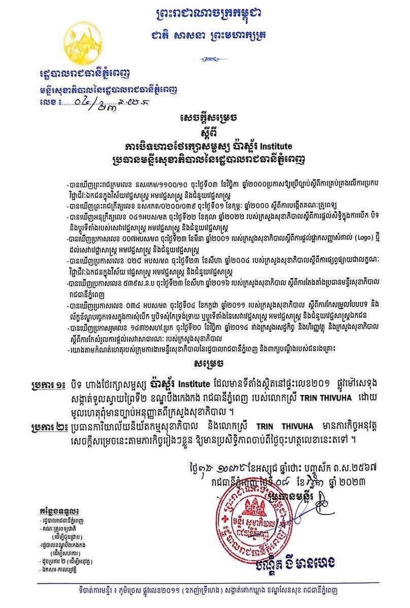 រាជធានីភ្នំពេញ៖ នៅថ្ងៃទី០៨ ខែវិច្ឆិកា ឆ្នាំ២០២៣ យោងតាមការចុះផ្សាយរបស់ ក្រសួងសុខាភិបាល បានចេញសេចក្តីសម្រេចស្តីពីការបិទហាងថែរក្សាសម្ផស្ស ប៉ាស្ទ័រ Institute ដែលមានទីតាំងស្ថិតនៅផ្ទះលេខ២០១ ផ្លូវម៉ៅសេទុង សង្កាត់ទួលស្វាយព្រៃទី២ ខណ្ឌបឹងកេងកង រាជធានីភ្នំពេញ។