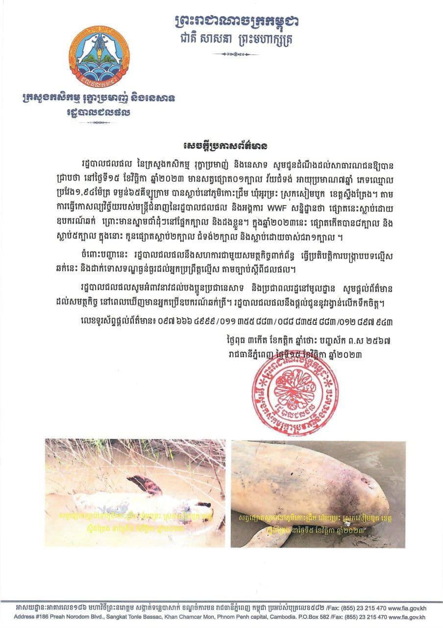 រដ្ឋបាលជលផល នៃក្រសួងកសិកម្ម រុក្ខាប្រមាញ់ និងនេសាទ សូមជូនដំណឹងដល់សាធារណជនឱ្យបាន ជ្រាបថា នៅថ្ងៃទី១៥ ខែវិច្ឆិកា ឆ្នាំ២០២៣ មានសត្វផ្សោត០១ក្បាល វ័យជំទង់ អាយុប្រមាណ ៧ឆ្នាំ ភេទឈ្មោល ប្រវែង១,៩៤ម៉ែត្រ ទម្ងន់៦៥គីឡូក្រាម បានស្លាប់នៅភូមិកោះជ្រឹម ឃុំអូរម្រះ ស្រុកសៀមបូក ខេត្តស្ទឹងត្រែង។ តាមការធ្វើកោសល្យវិច្ច័យរបស់មន្ត្រីជំនាញនៃរដ្ឋបាលជលផល និងអង្គការ WWF សន្និដ្ឋានថា ផ្សោតនេះស្លាប់ដោយ ឧបករណ៍ឆក់ ព្រោះមានស្នាមជាំដុំៗនៅផ្នែកក្បាល និងដងខ្លួន។ ក្នុងឆ្នាំ២០២៣នេះ ផ្សោតកើតបាន៨ក្បាល និង ស្លាប់៥ក្បាល ក្នុងនោះ កូនផ្សោតស្លាប់២ក្បាល ជំទង់២ក្បាល និងស្លាប់ដោយចាស់ជរា១ក្បាល។